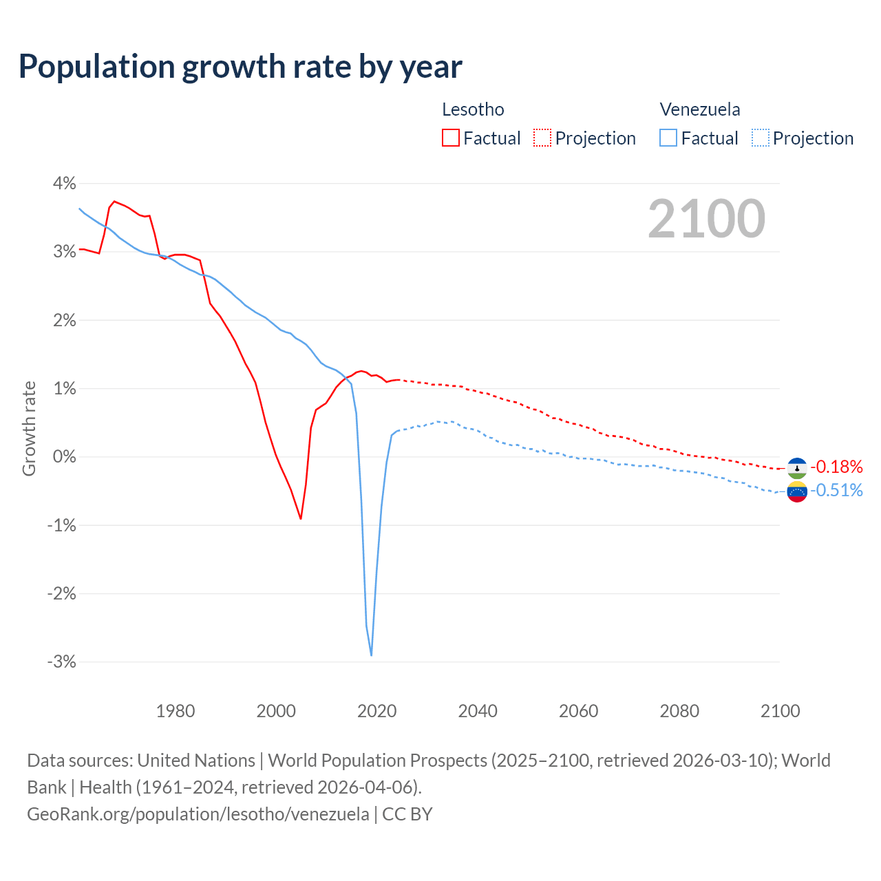 - For the last 10 years, Lesotho has had an average growth rate of +1.17% per year vs -0.46% in Venezuela.