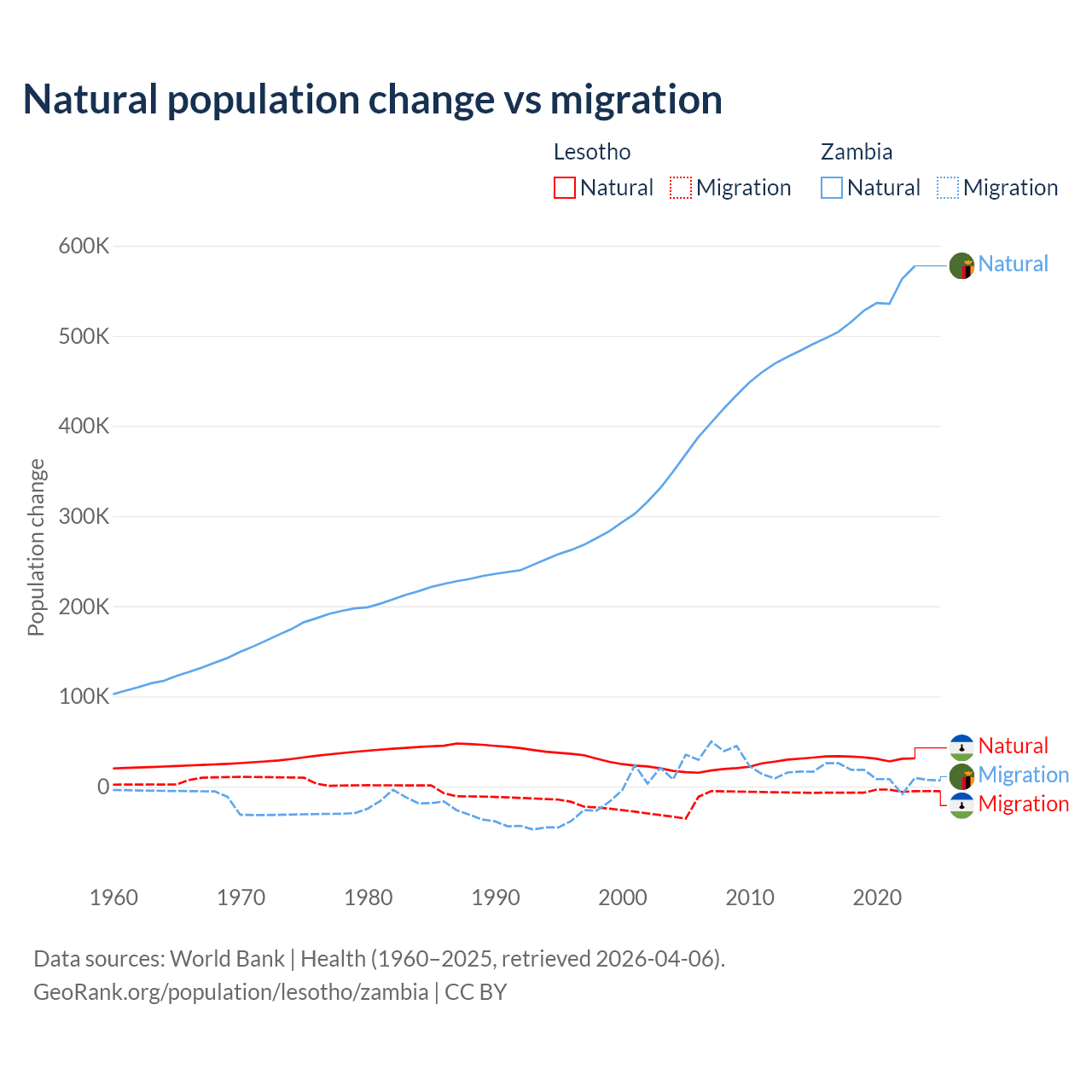 Over the last 10 years, 84.2% of the population change in Lesotho is from natural causes (a gain of 315,836 people) and 15.8% is from migration (a loss of 59,457 people). In Zambia 97.4% is from natural causes (a gain of 5,233,797 people) and 2.58% is from migration (a gain of 138,554 people).