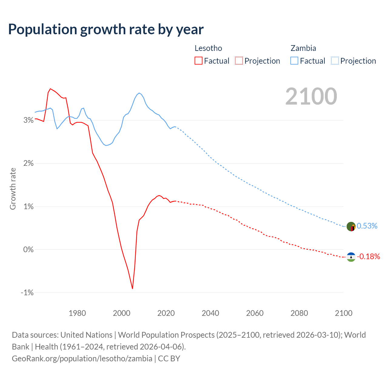 Lesotho vs Zambia: population by year and forecast