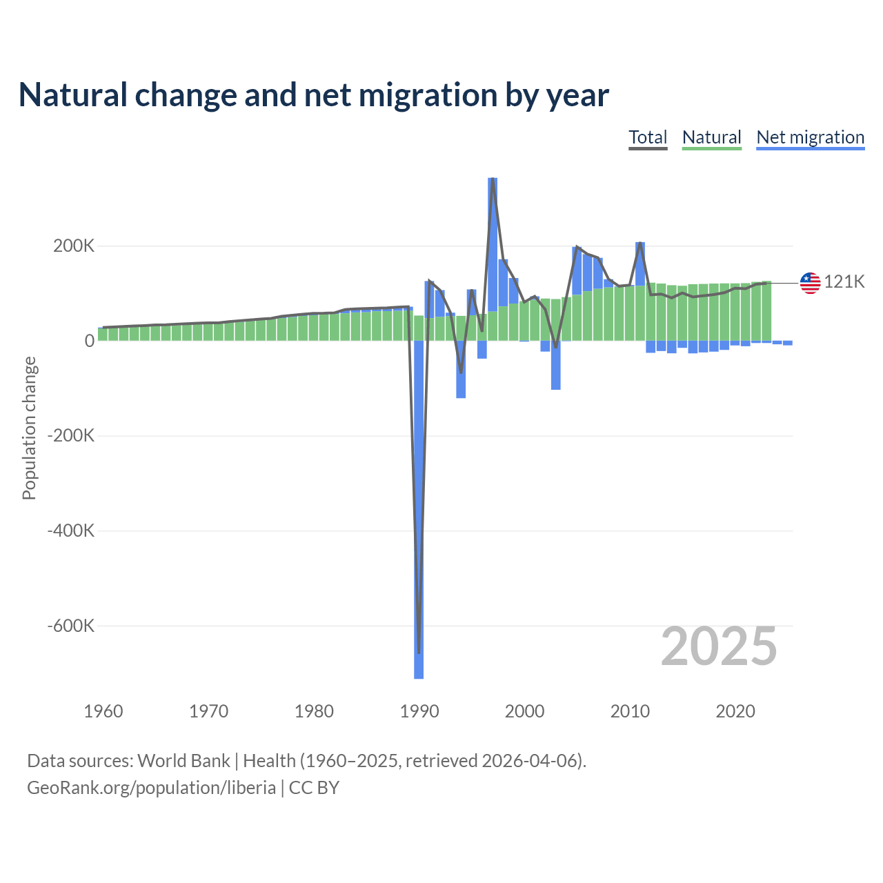 Over the last 10 years, 87.7% of the population change in Liberia is from natural causes (a gain of 1,202,387 people) and 12.3% is from migration (a loss of 168,316 people).