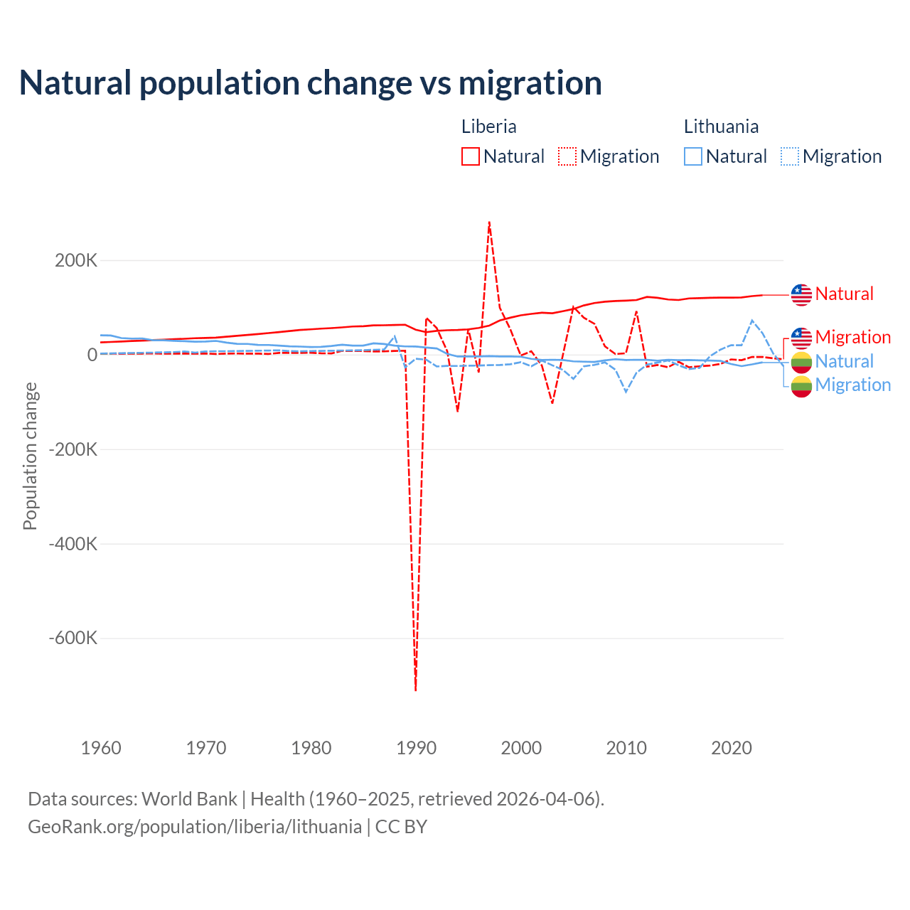 Over the last 10 years, 87.7% of the population change in Liberia is from natural causes (a gain of 1,202,387 people) and 12.3% is from migration (a loss of 168,316 people). In Lithuania 68.7% is from natural causes (a loss of 153,859 people) and 31.3% is from migration (a gain of 70,196 people).