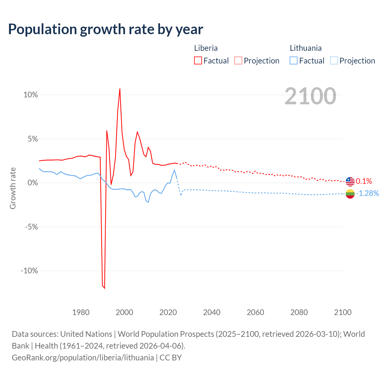 - For the last 10 years, Liberia has had an average growth rate of +2.09% per year vs -0.22% in Lithuania.