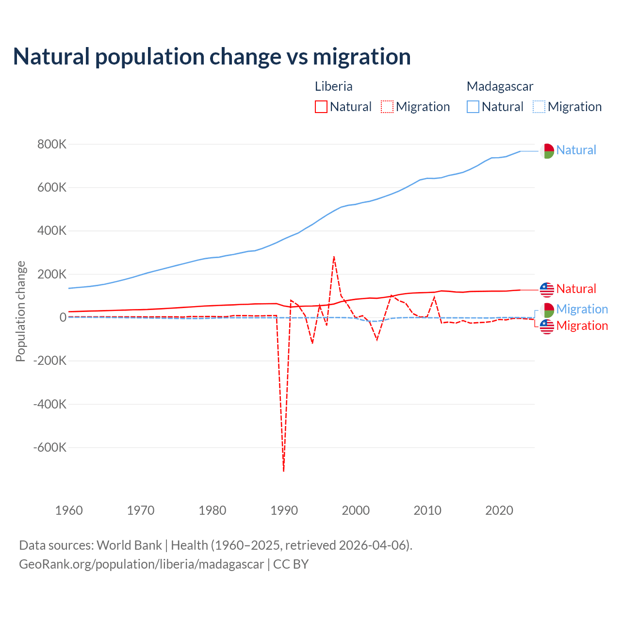 Over the last 10 years, 87.7% of the population change in Liberia is from natural causes (a gain of 1,202,387 people) and 12.3% is from migration (a loss of 168,316 people). In Madagascar 99.7% is from natural causes (a gain of 7,165,578 people) and 0.31% is from migration (a loss of 22,384 people).