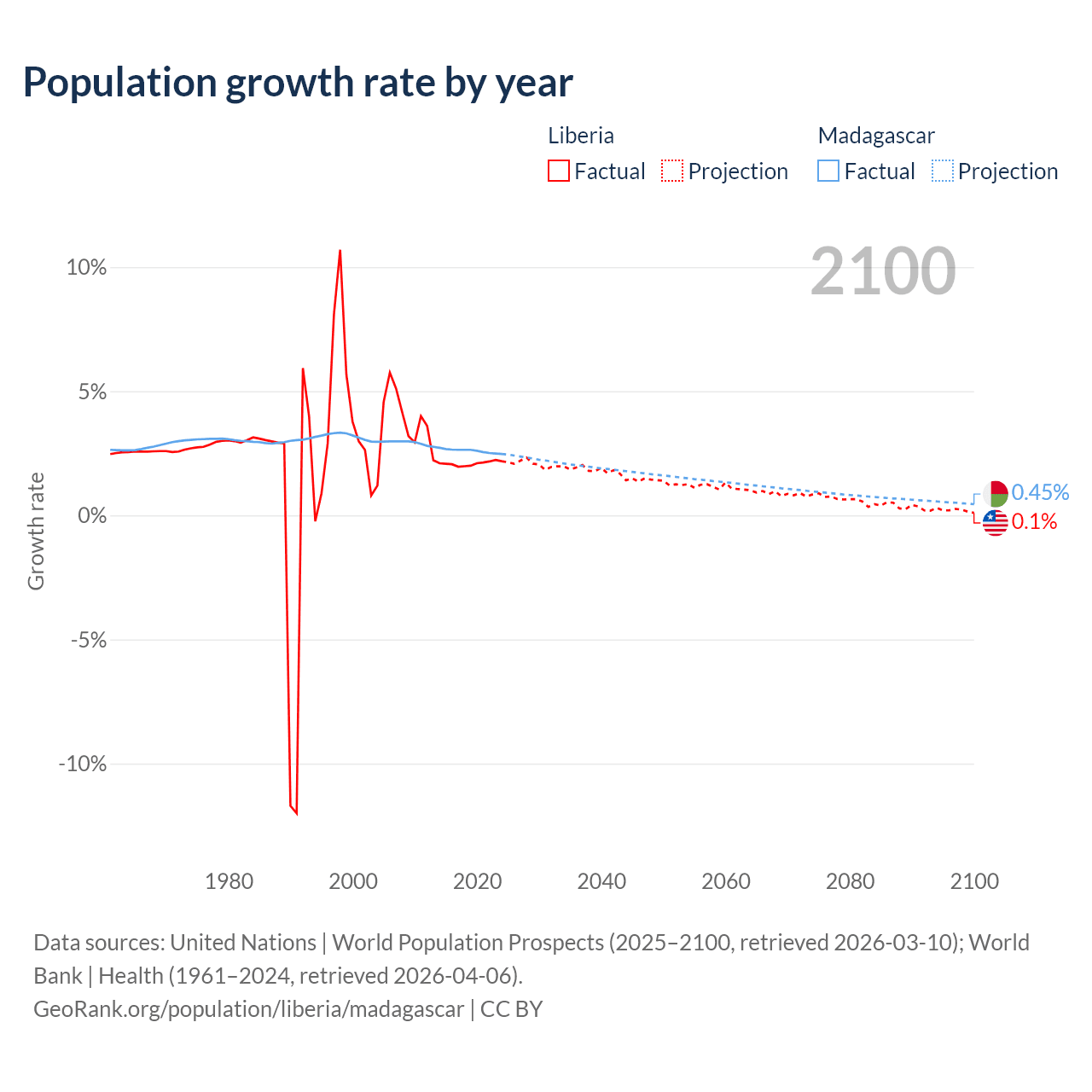 - For the last 10 years, Liberia has had an average growth rate of +2.09% per year vs +2.6% in Madagascar.