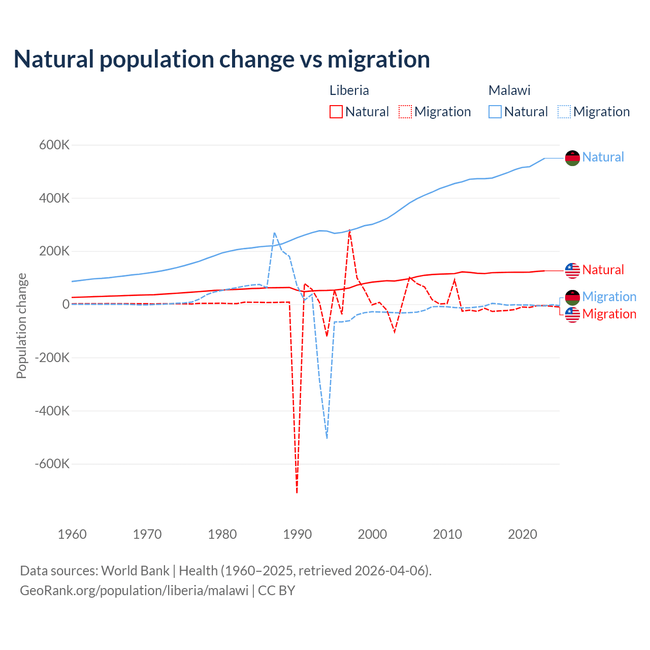 Over the last 10 years, 87.7% of the population change in Liberia is from natural causes (a gain of 1,202,387 people) and 12.3% is from migration (a loss of 168,316 people). In Malawi 99.3% is from natural causes (a gain of 5,019,393 people) and 0.67% is from migration (a loss of 33,768 people).