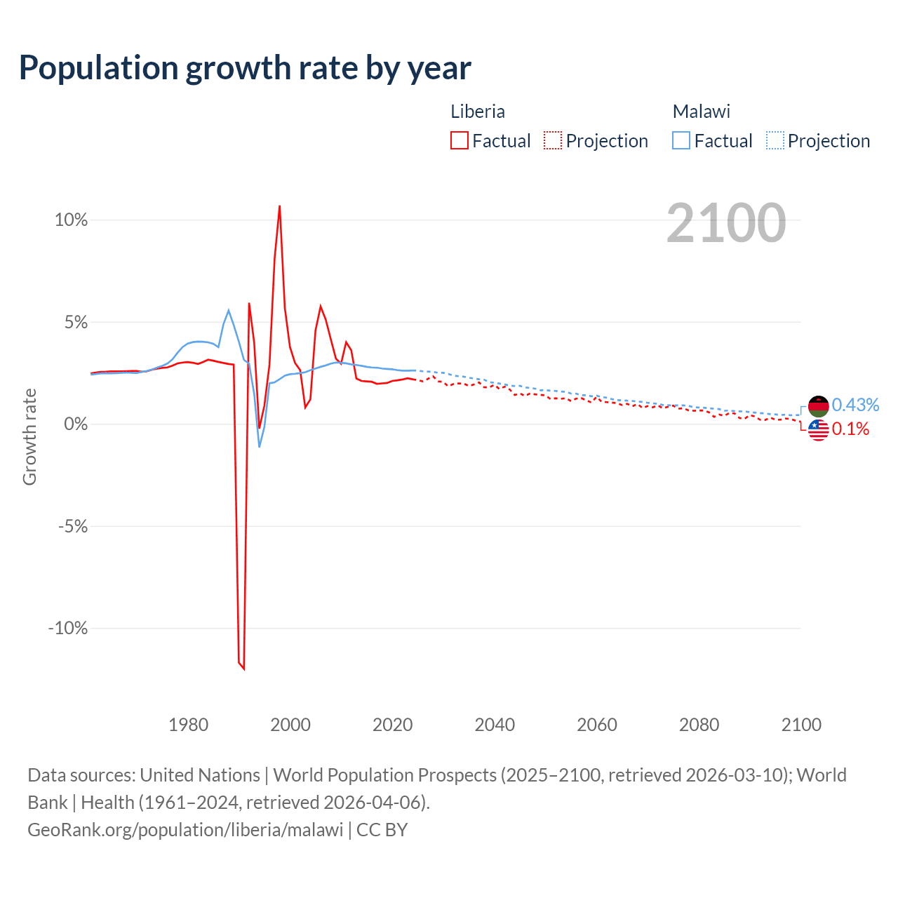 - For the last 10 years, Liberia has had an average growth rate of +2.09% per year vs +2.7% in Malawi.