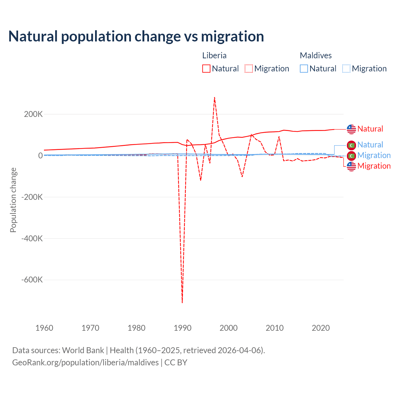 Over the last 10 years, 87.7% of the population change in Liberia is from natural causes (a gain of 1,202,387 people) and 12.3% is from migration (a loss of 168,316 people). In Maldives 42.7% is from natural causes (a gain of 51,342 people) and 57.3% is from migration (a gain of 68,788 people).