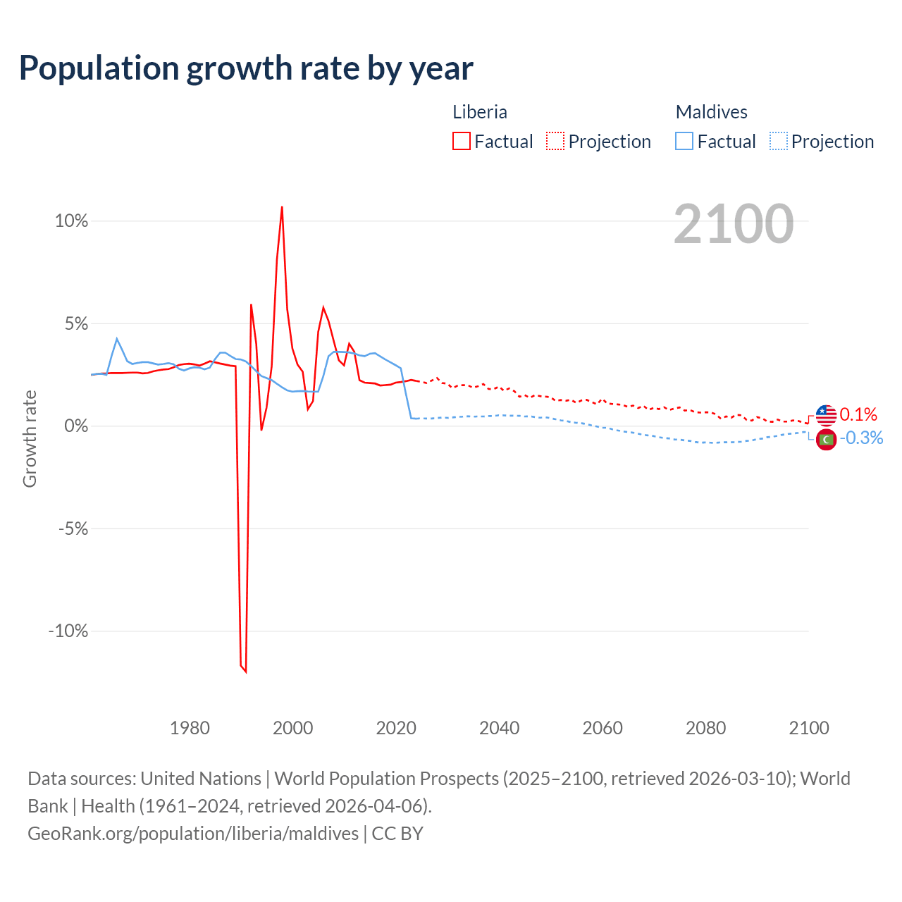 - For the last 10 years, Liberia has had an average growth rate of +2.09% per year vs +2.56% in Maldives.