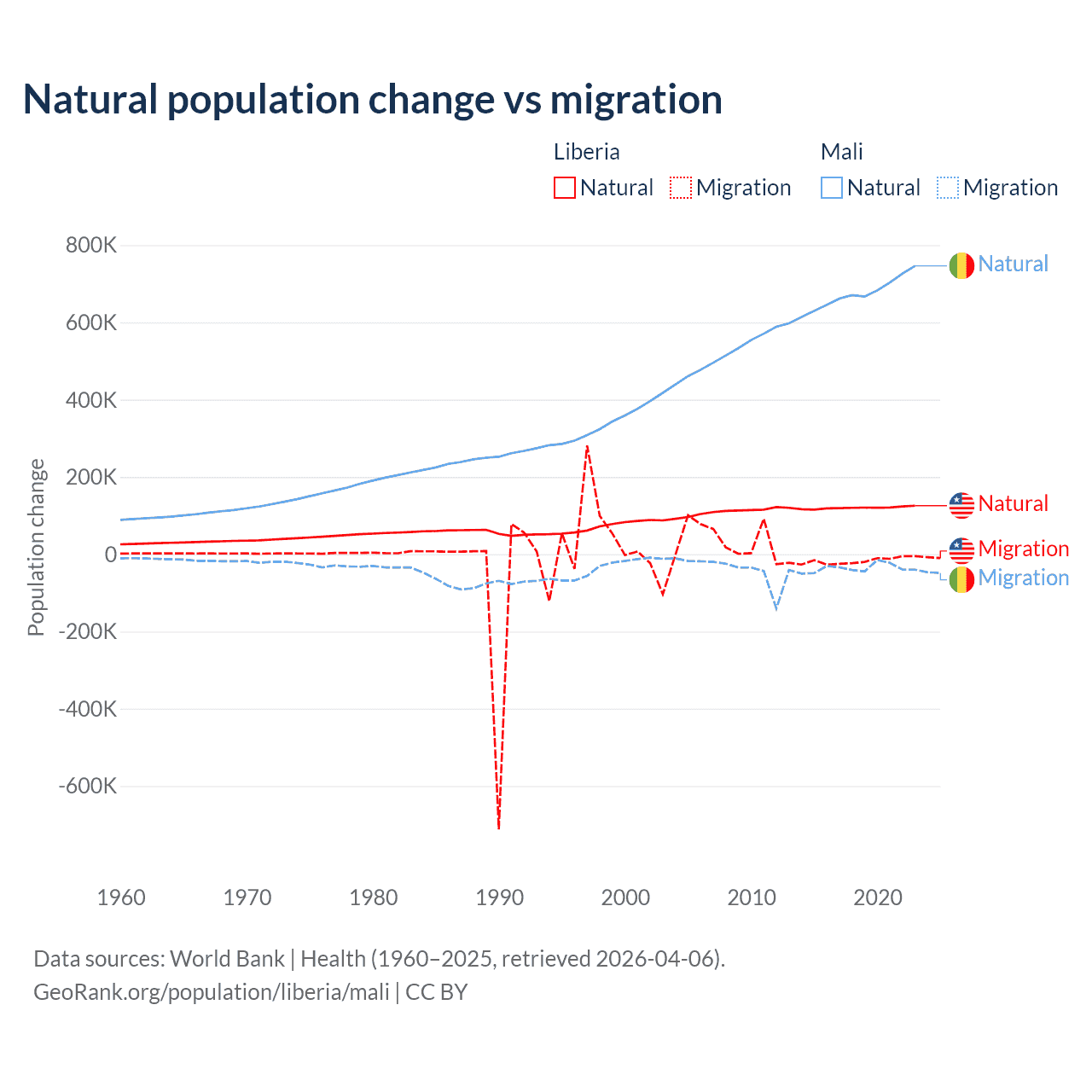 Over the last 10 years, 87.7% of the population change in Liberia is from natural causes (a gain of 1,202,387 people) and 12.3% is from migration (a loss of 168,316 people). In Mali 94.9% is from natural causes (a gain of 6,749,473 people) and 5.13% is from migration (a loss of 365,292 people).