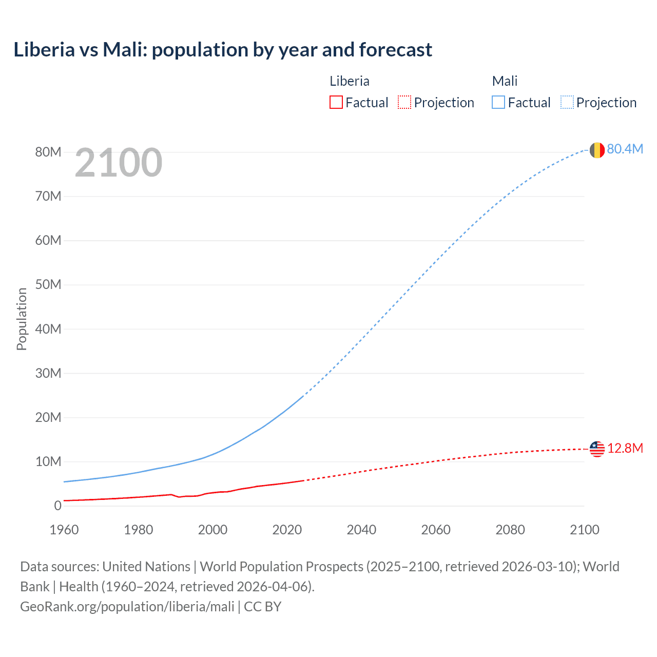 The latest officially reported population of Liberia was 5,612,817 in 2024 vs 24,478,595 people in Mali in 2024. In 2026, based on the adjusted UN estimation, the current Liberia's population is 5,887,000 people compared to 26,143,152 in Mali.