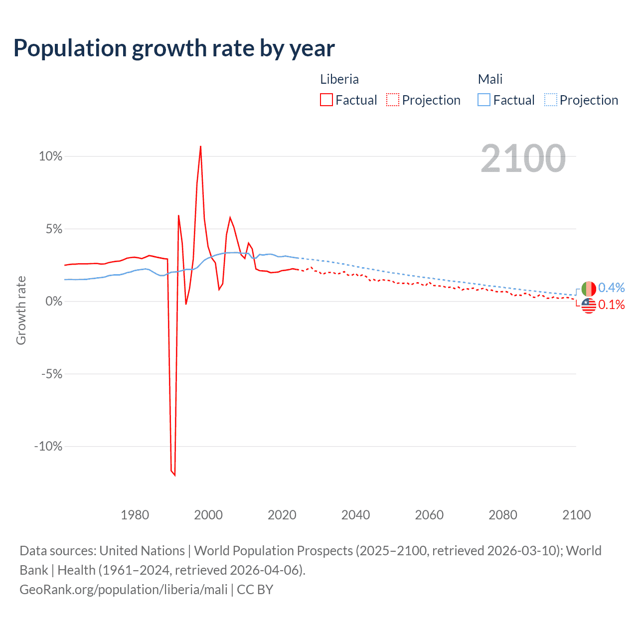 - For the last 10 years, Liberia has had an average growth rate of +2.09% per year vs +3.12% in Mali.