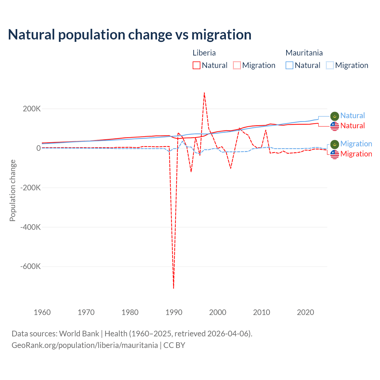 Over the last 10 years, 87.7% of the population change in Liberia is from natural causes (a gain of 1,202,387 people) and 12.3% is from migration (a loss of 168,316 people). In Mauritania 98.9% is from natural causes (a gain of 1,320,903 people) and 1.12% is from migration (a loss of 14,982 people).