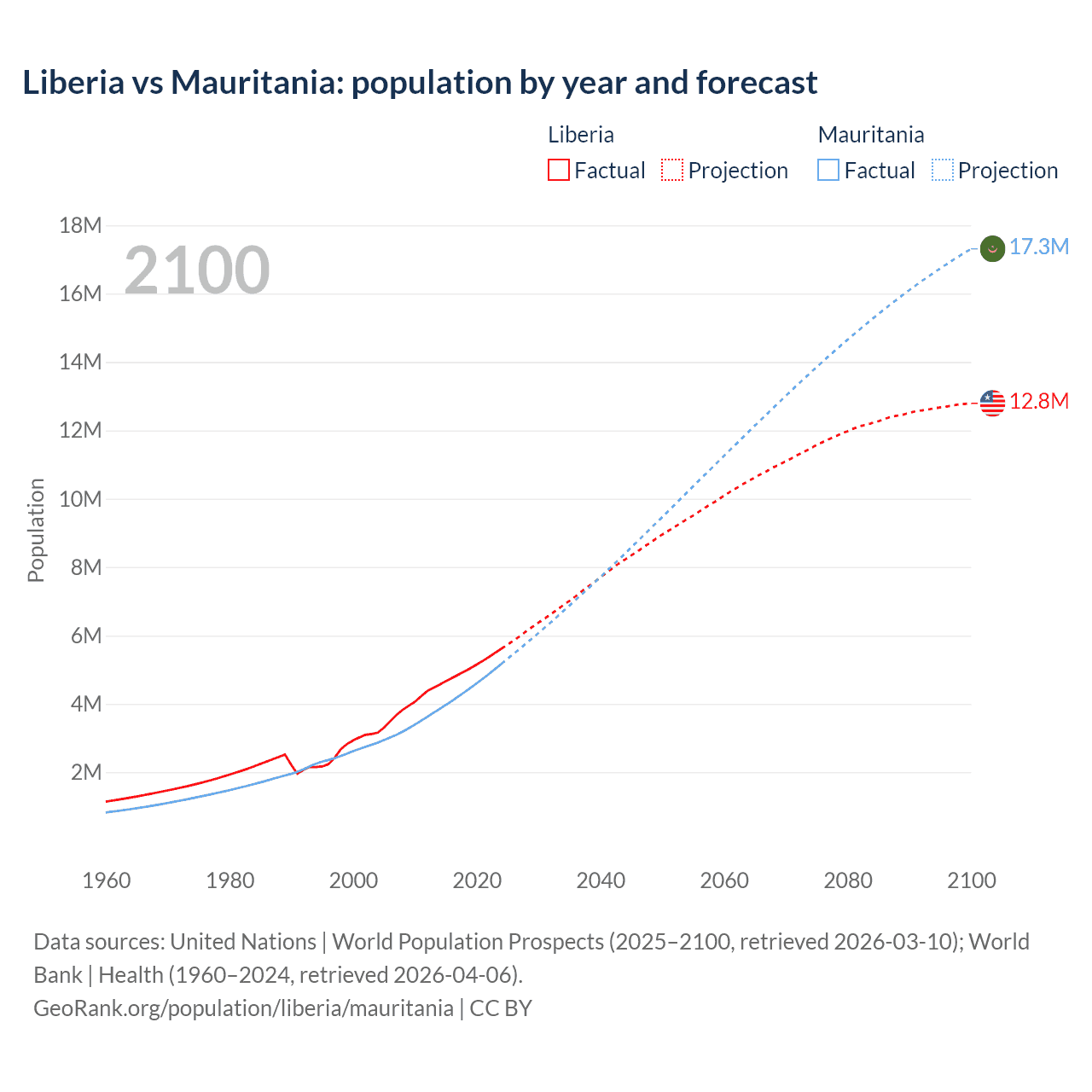The latest officially reported population of Liberia was 5,612,817 in 2024 vs 5,169,395 people in Mauritania in 2024. In 2026, based on the adjusted UN estimation, the current Liberia's population is 5,887,000 people compared to 5,505,206 in Mauritania.