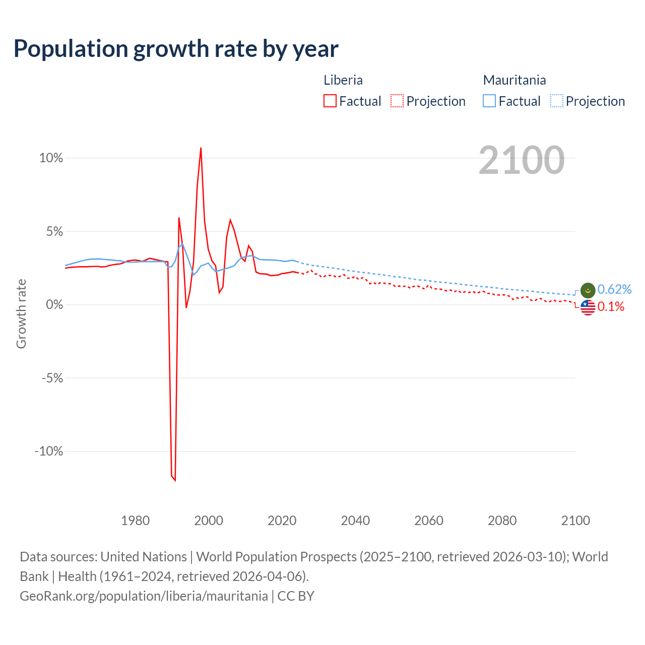 - For the last 10 years, Liberia has had an average growth rate of +2.09% per year vs +3% in Mauritania.