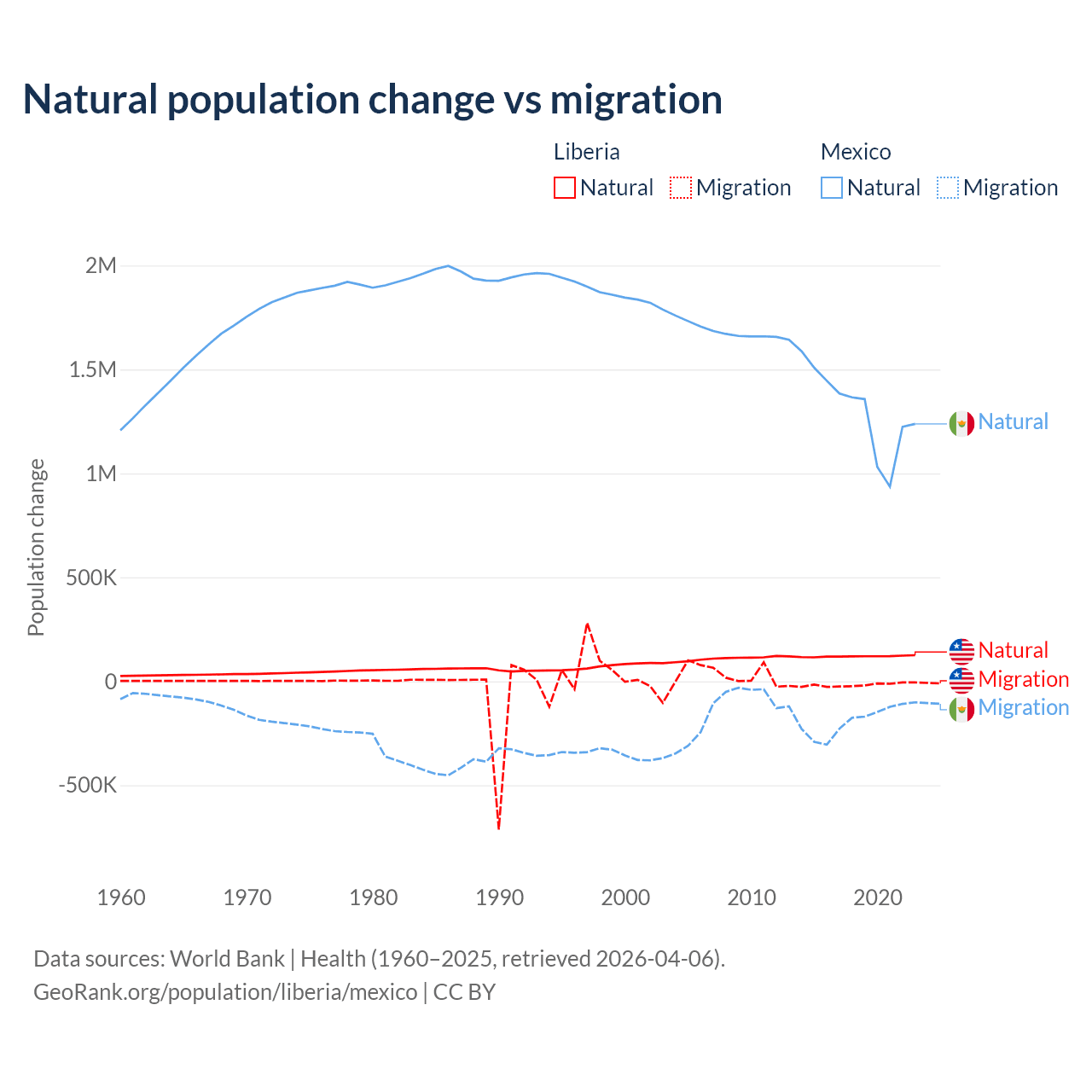 Over the last 10 years, 87.7% of the population change in Liberia is from natural causes (a gain of 1,202,387 people) and 12.3% is from migration (a loss of 168,316 people). In Mexico 87.5% is from natural causes (a gain of 13,080,136 people) and 12.5% is from migration (a loss of 1,876,544 people).