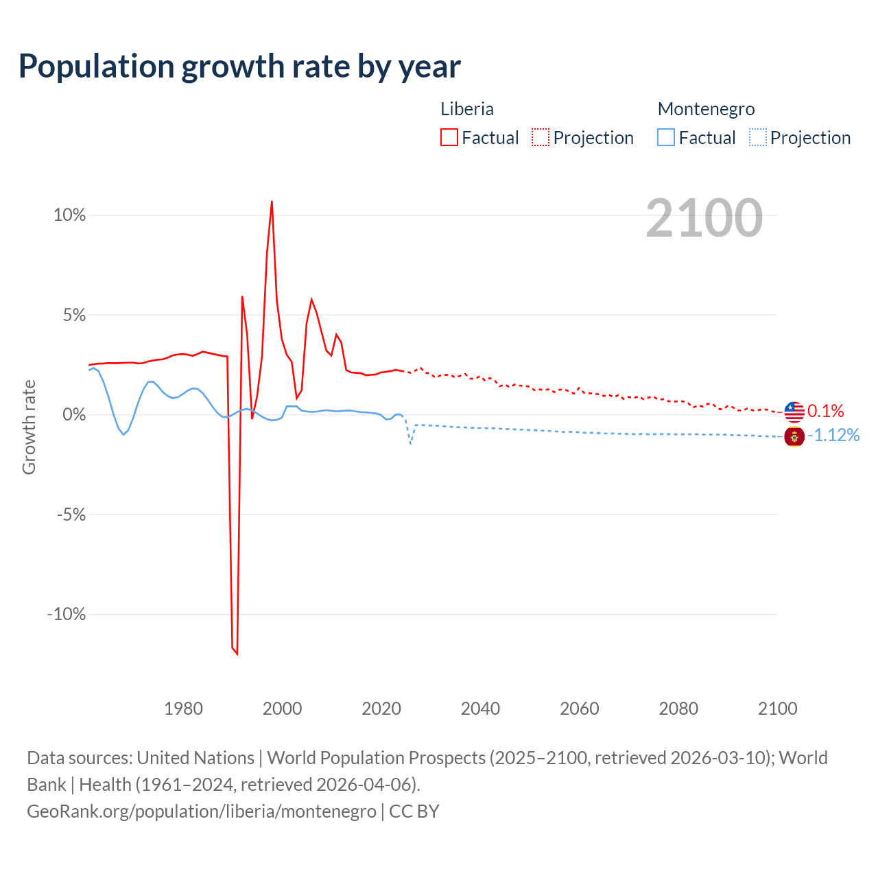 - For the last 10 years, Liberia has had an average growth rate of +2.09% per year vs +0.01% in Montenegro.