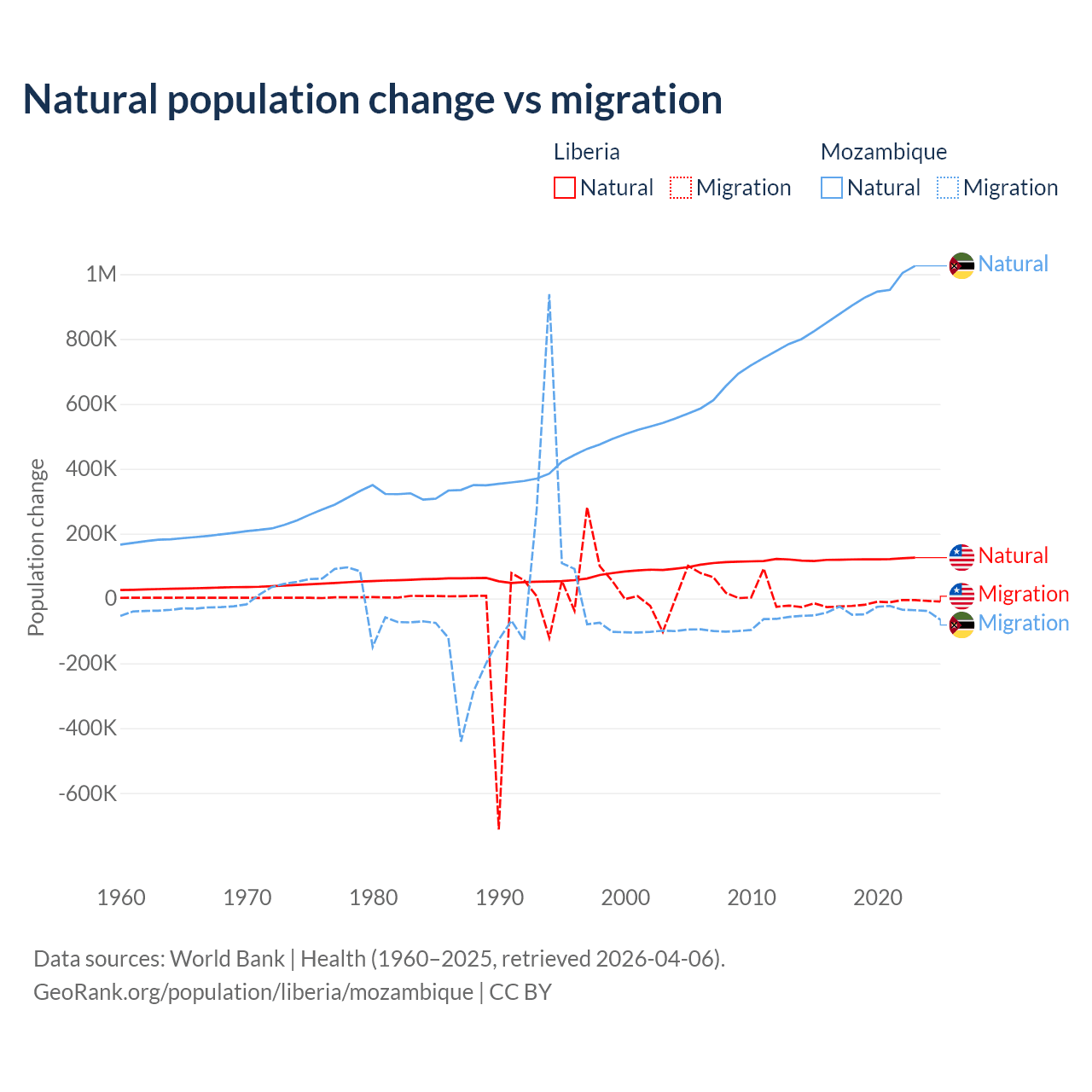 Over the last 10 years, 87.7% of the population change in Liberia is from natural causes (a gain of 1,202,387 people) and 12.3% is from migration (a loss of 168,316 people). In Mozambique 95.9% is from natural causes (a gain of 9,108,203 people) and 4.15% is from migration (a loss of 393,923 people).