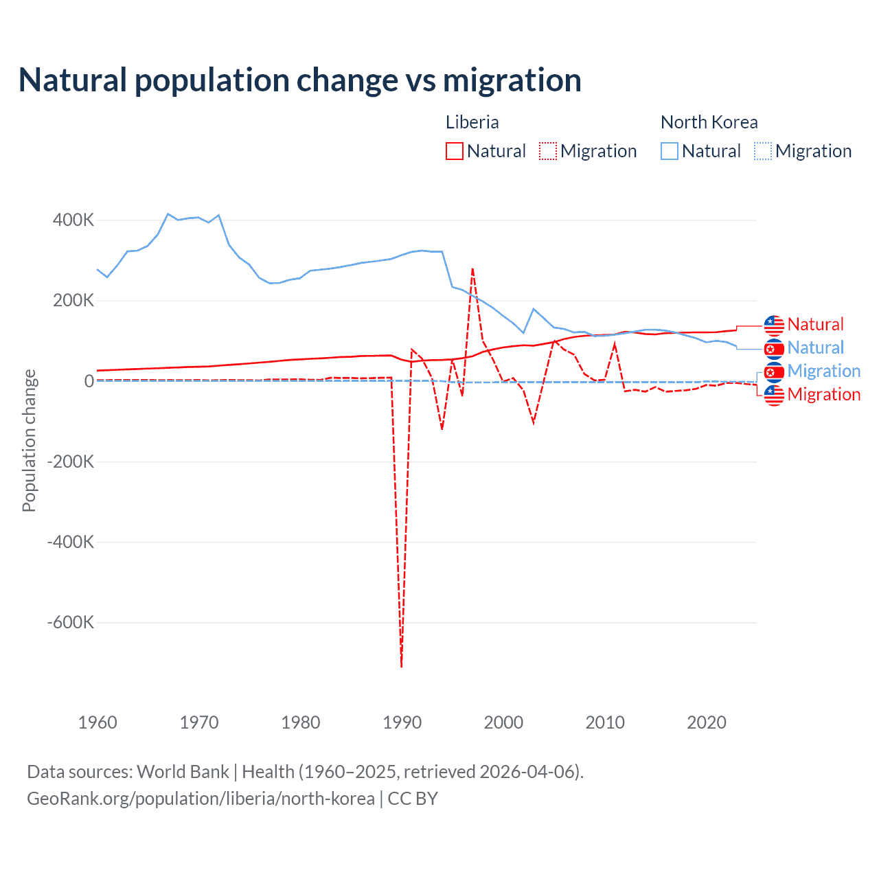 Over the last 10 years, 87.7% of the population change in Liberia is from natural causes (a gain of 1,202,387 people) and 12.3% is from migration (a loss of 168,316 people). In North Korea 97.7% is from natural causes (a gain of 1,097,372 people) and 2.33% is from migration (a loss of 26,227 people).