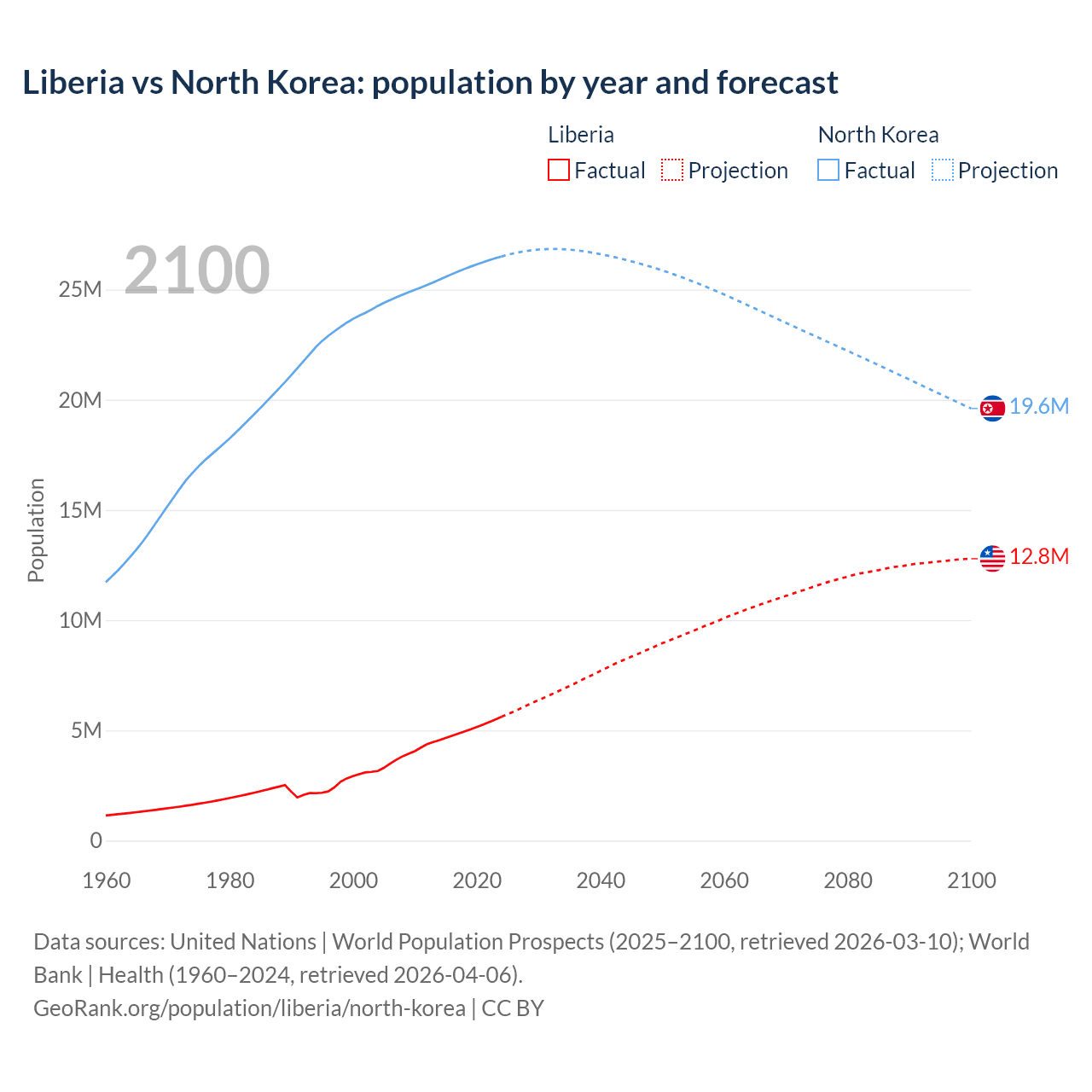Liberia vs North Korea: population by year and forecast