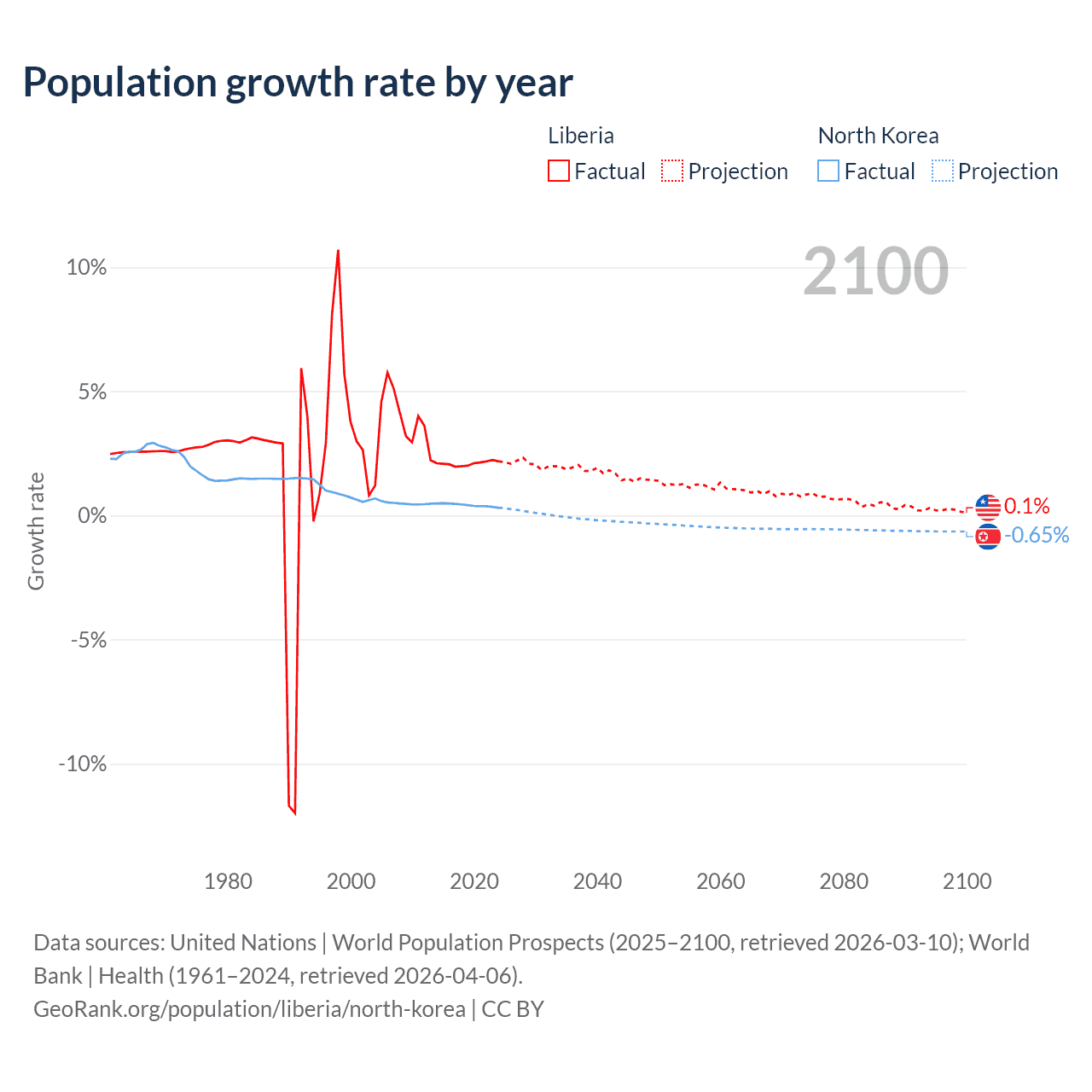 - For the last 10 years, Liberia has had an average growth rate of +2.09% per year vs +0.41% in North Korea.