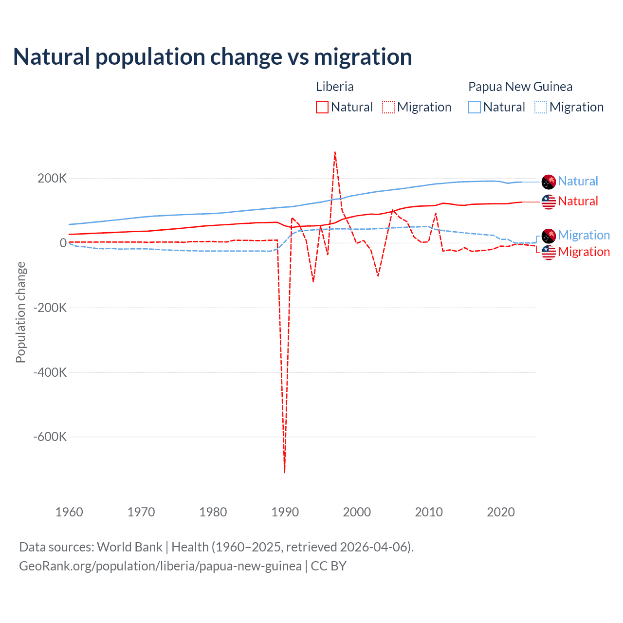 Over the last 10 years, 87.7% of the population change in Liberia is from natural causes (a gain of 1,202,387 people) and 12.3% is from migration (a loss of 168,316 people). In Papua New Guinea 91% is from natural causes (a gain of 1,883,906 people) and 8.98% is from migration (a gain of 185,900 people).