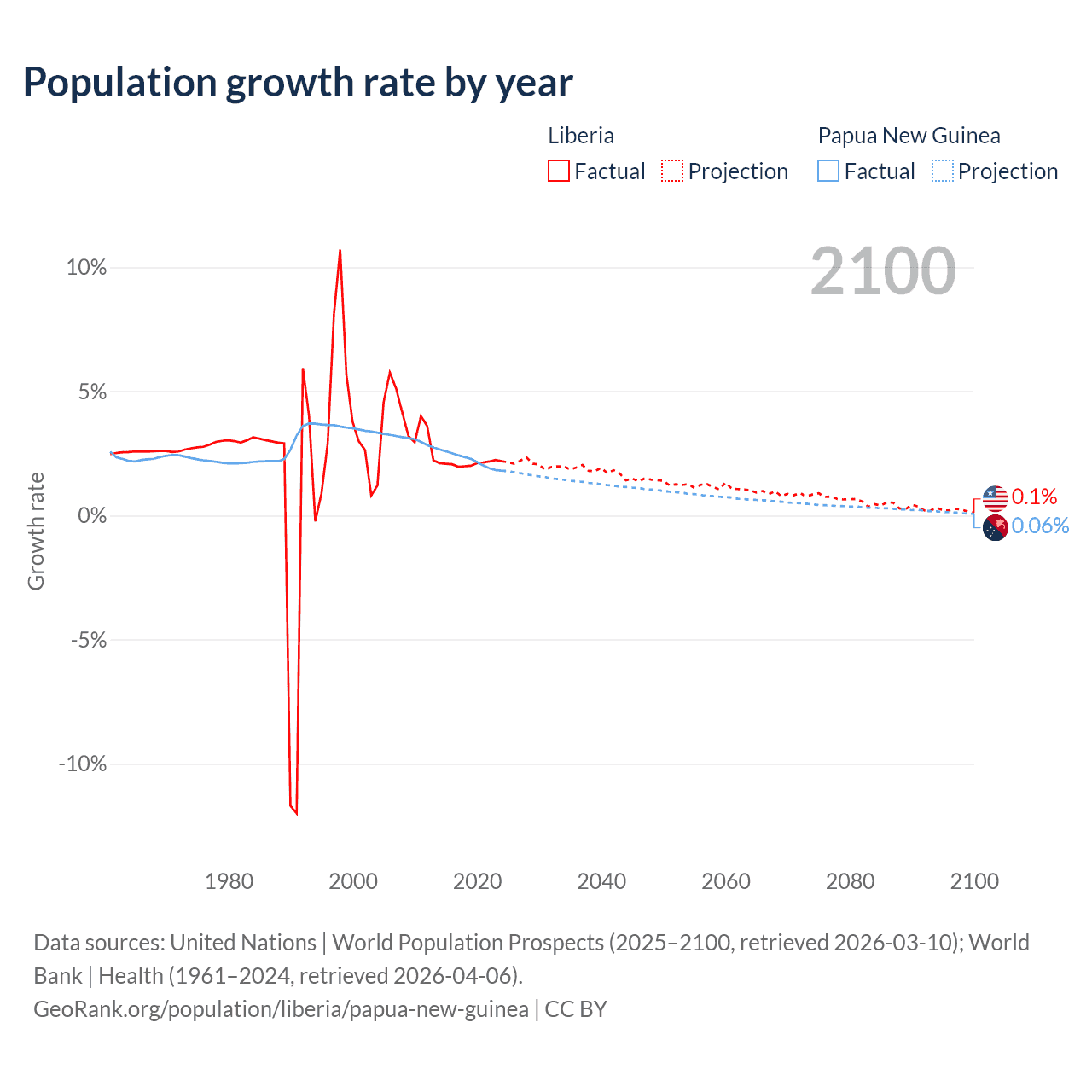 - For the last 10 years, Liberia has had an average growth rate of +2.09% per year vs +2.23% in Papua New Guinea.