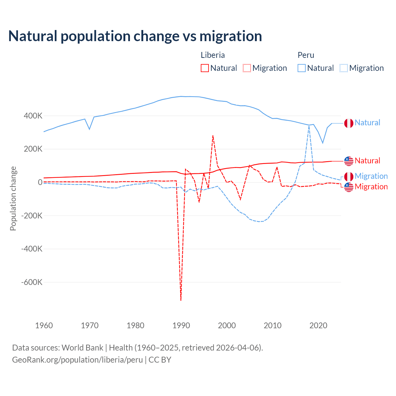Over the last 10 years, 87.7% of the population change in Liberia is from natural causes (a gain of 1,202,387 people) and 12.3% is from migration (a loss of 168,316 people). In Peru 82% is from natural causes (a gain of 3,345,822 people) and 18% is from migration (a gain of 732,505 people).