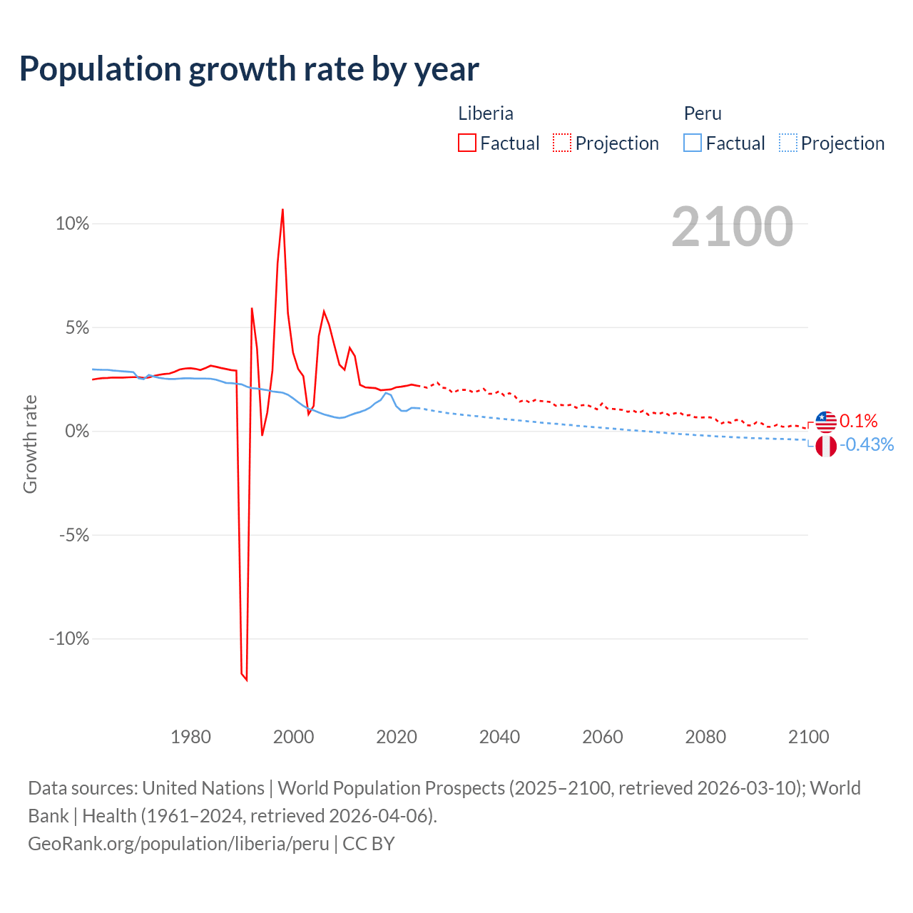 - For the last 10 years, Liberia has had an average growth rate of +2.09% per year vs +1.26% in Peru.