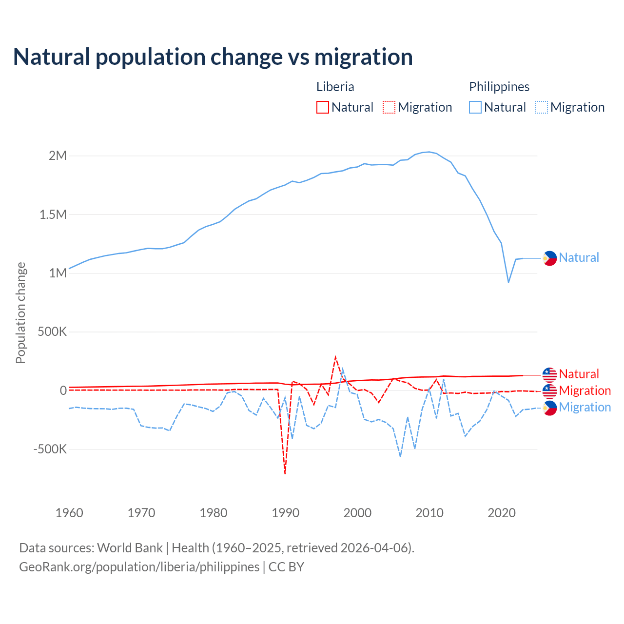 Over the last 10 years, 87.7% of the population change in Liberia is from natural causes (a gain of 1,202,387 people) and 12.3% is from migration (a loss of 168,316 people). In the Philippines 88.5% is from natural causes (a gain of 14,279,705 people) and 11.5% is from migration (a loss of 1,848,117 people).