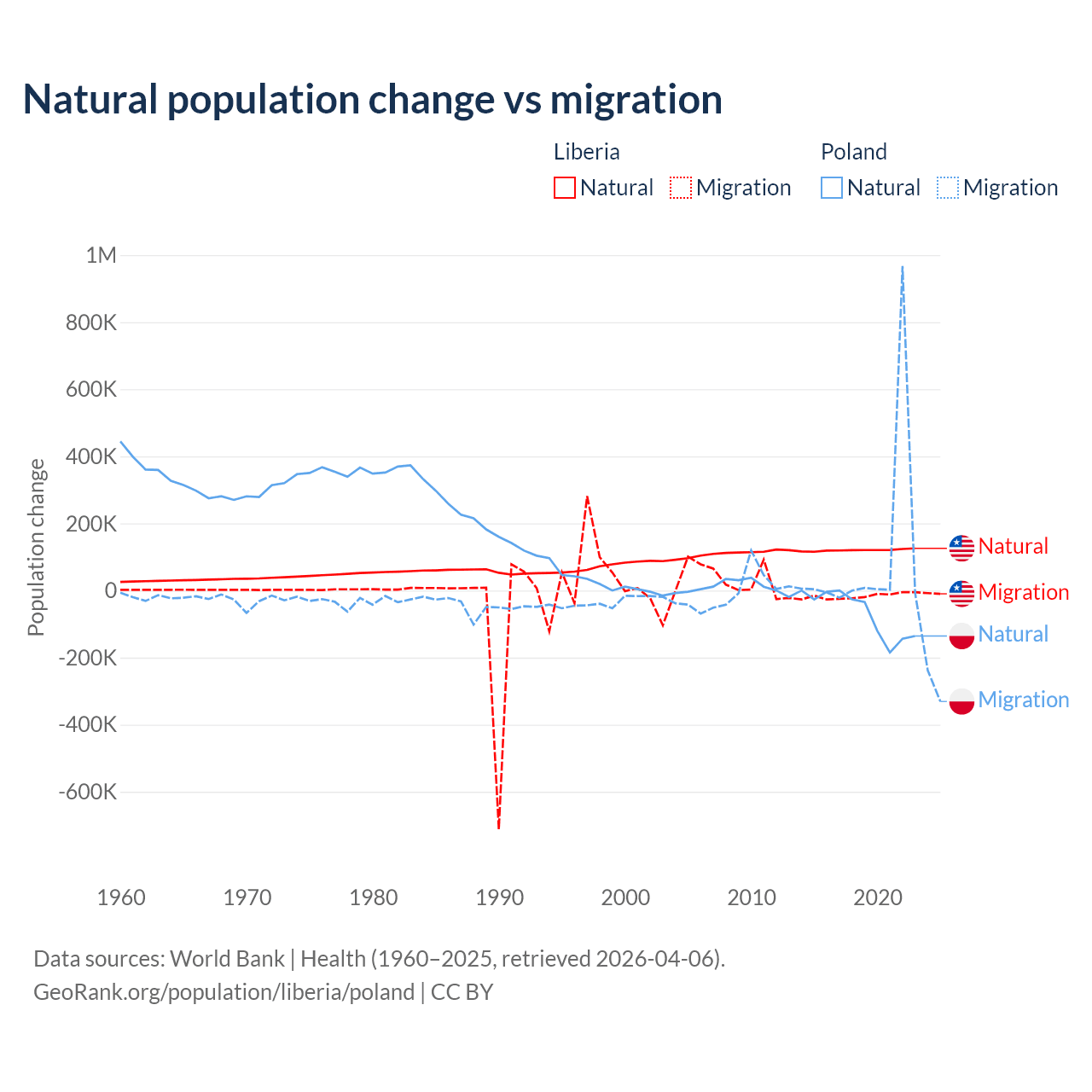 Over the last 10 years, 87.7% of the population change in Liberia is from natural causes (a gain of 1,202,387 people) and 12.3% is from migration (a loss of 168,316 people). In Poland 41.4% is from natural causes (a loss of 675,443 people) and 58.6% is from migration (a gain of 955,766 people).