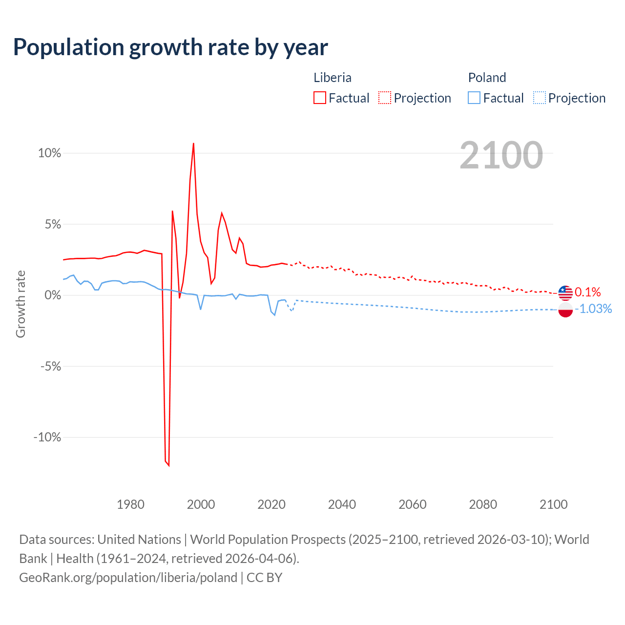 - For the last 10 years, Liberia has had an average growth rate of +2.09% per year vs -0.36% in Poland.
