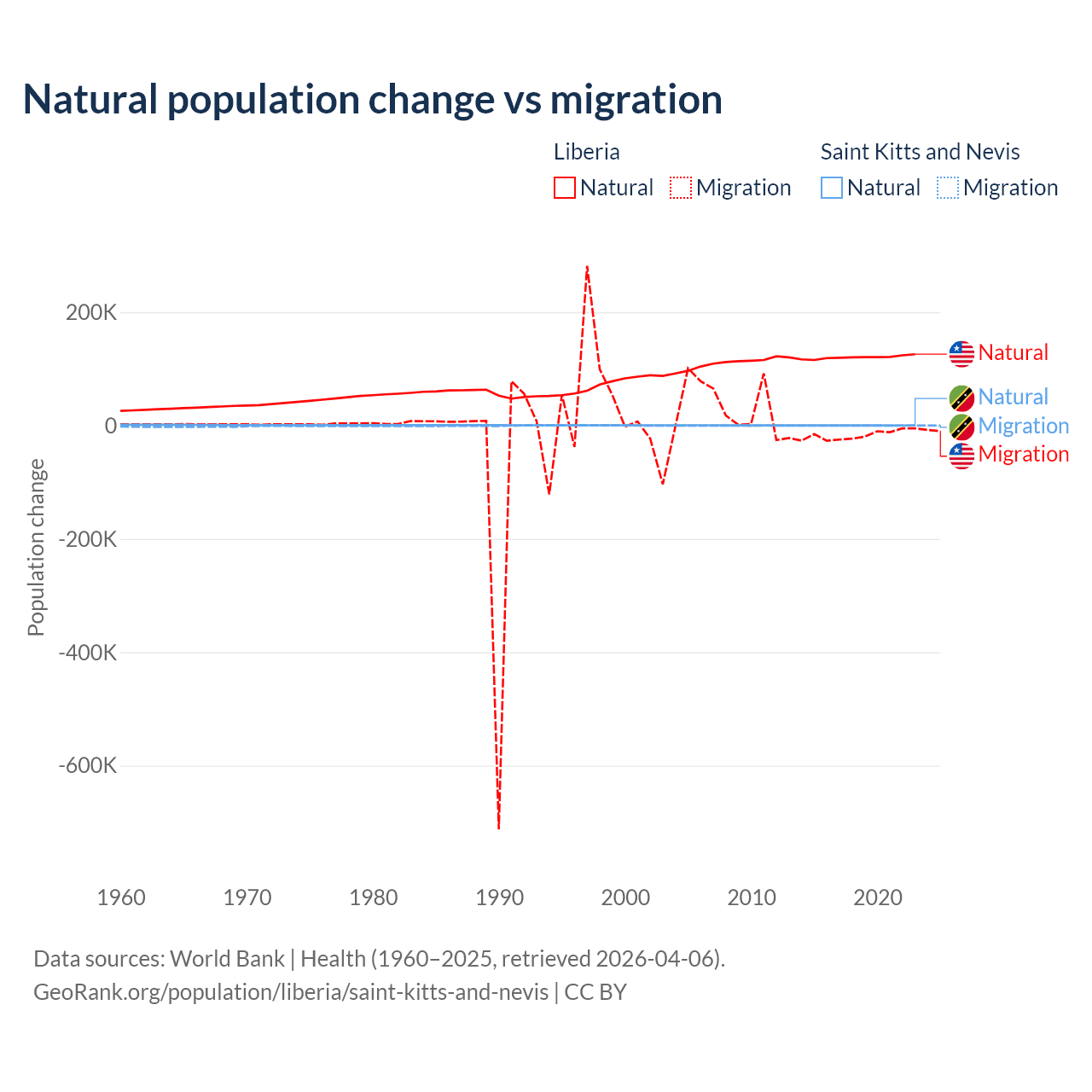 Over the last 10 years, 87.7% of the population change in Liberia is from natural causes (a gain of 1,202,387 people) and 12.3% is from migration (a loss of 168,316 people). In Saint Kitts and Nevis 44.9% is from natural causes (a gain of 1,225 people) and 55.1% is from migration (a loss of 1,506 people).