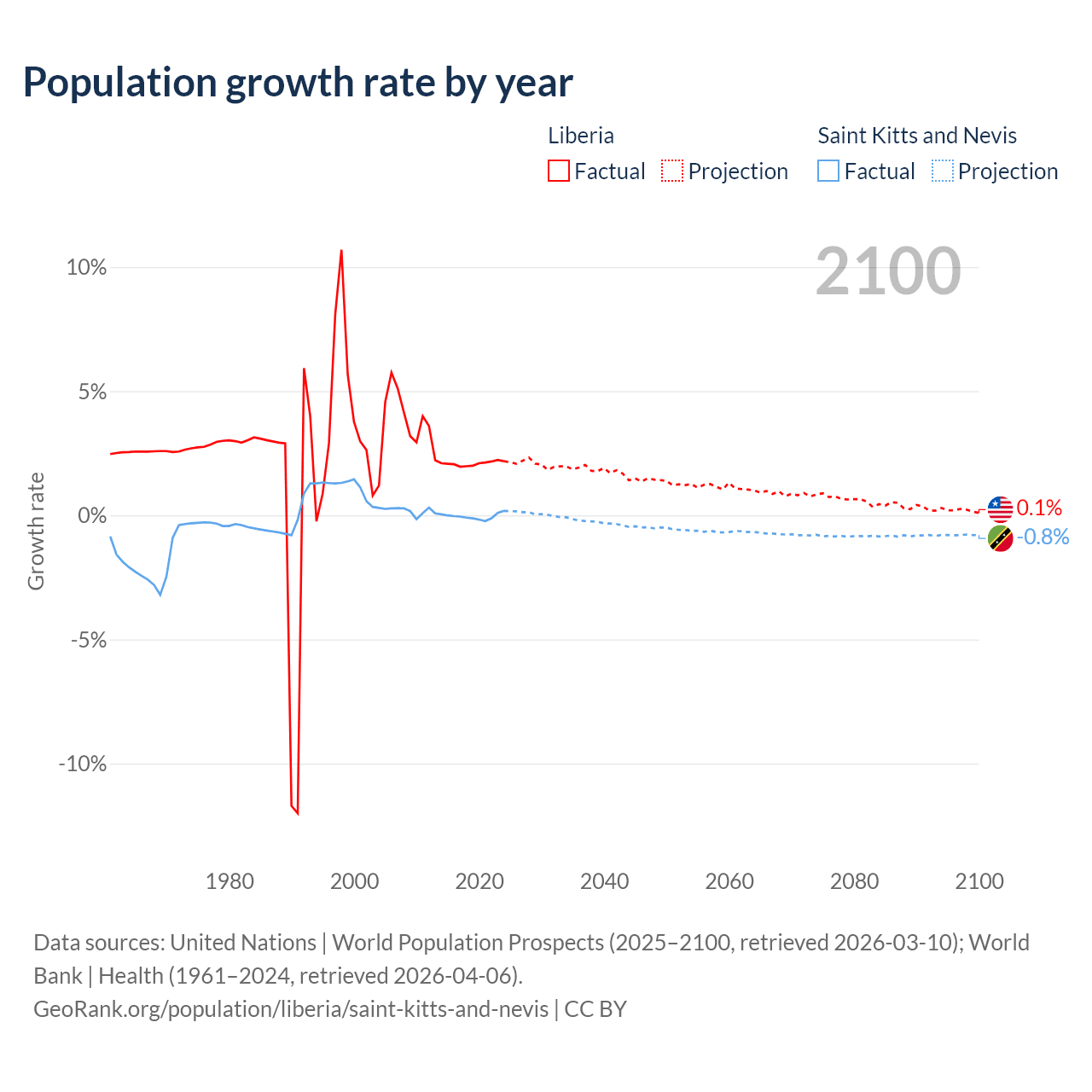 - For the last 10 years, Liberia has had an average growth rate of +2.09% per year vs -0.04% in Saint Kitts and Nevis.