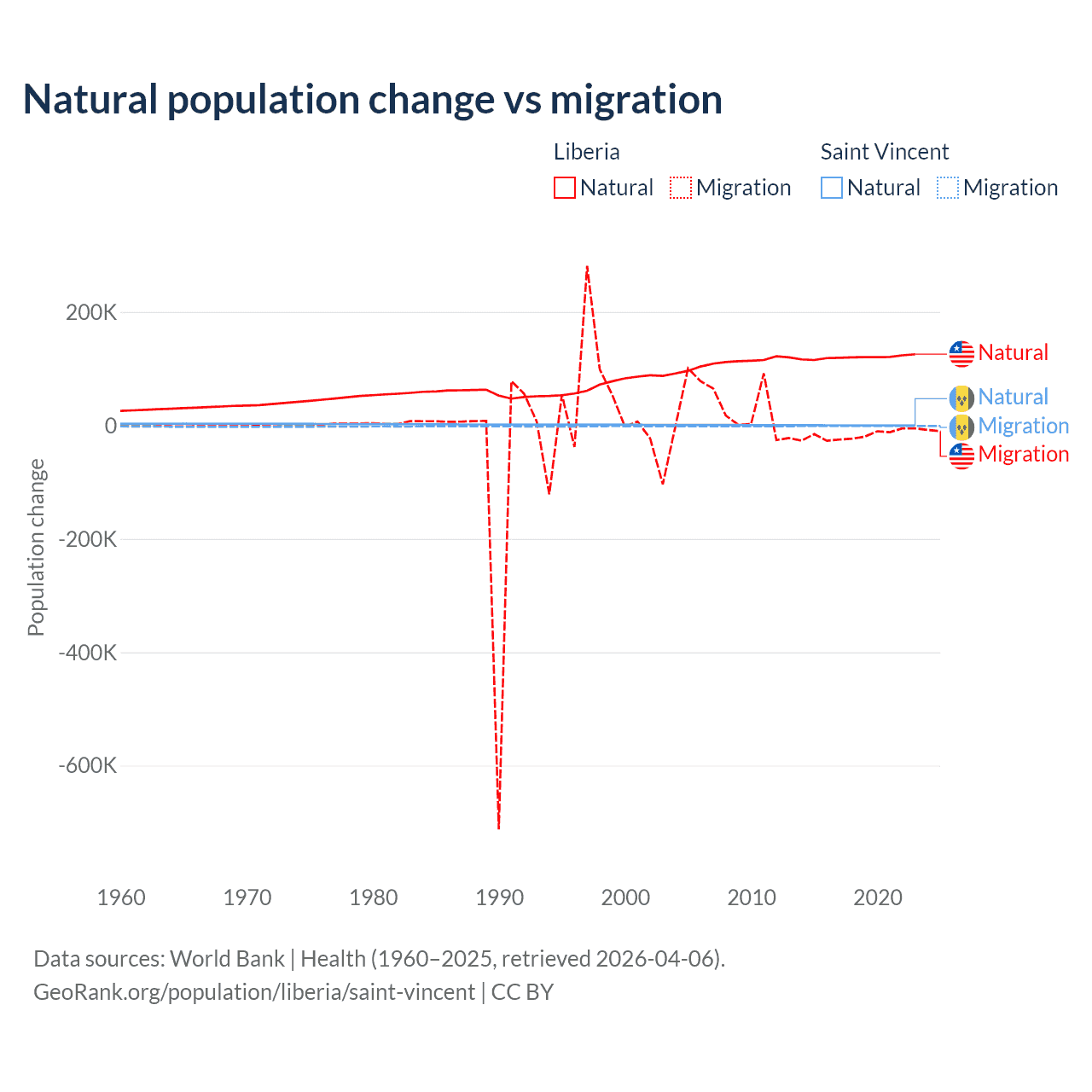 Over the last 10 years, 87.7% of the population change in Liberia is from natural causes (a gain of 1,202,387 people) and 12.3% is from migration (a loss of 168,316 people). In Saint Vincent 21.2% is from natural causes (a gain of 2,525 people) and 78.8% is from migration (a loss of 9,393 people).