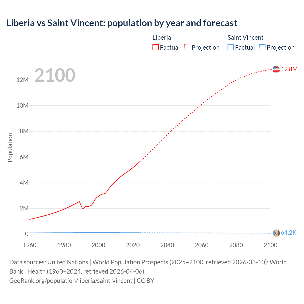 Liberia vs Saint Vincent: population by year and forecast