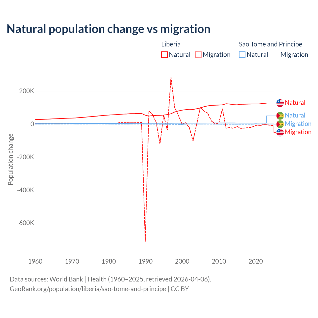 Over the last 10 years, 87.7% of the population change in Liberia is from natural causes (a gain of 1,202,387 people) and 12.3% is from migration (a loss of 168,316 people). In Sao Tome and Principe 80.1% is from natural causes (a gain of 50,822 people) and 19.9% is from migration (a loss of 12,621 people).