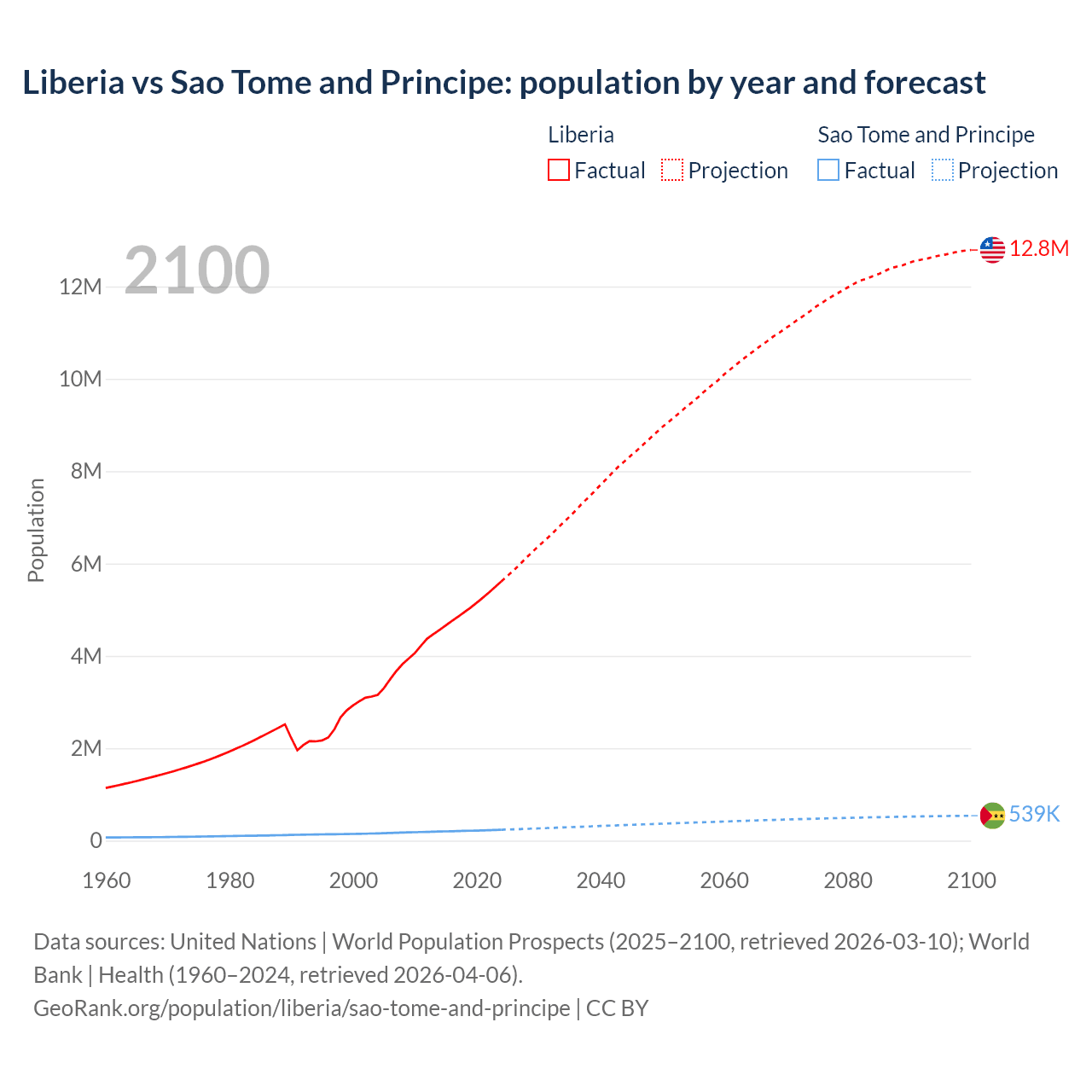 Liberia vs Sao Tome and Principe: population by year and forecast