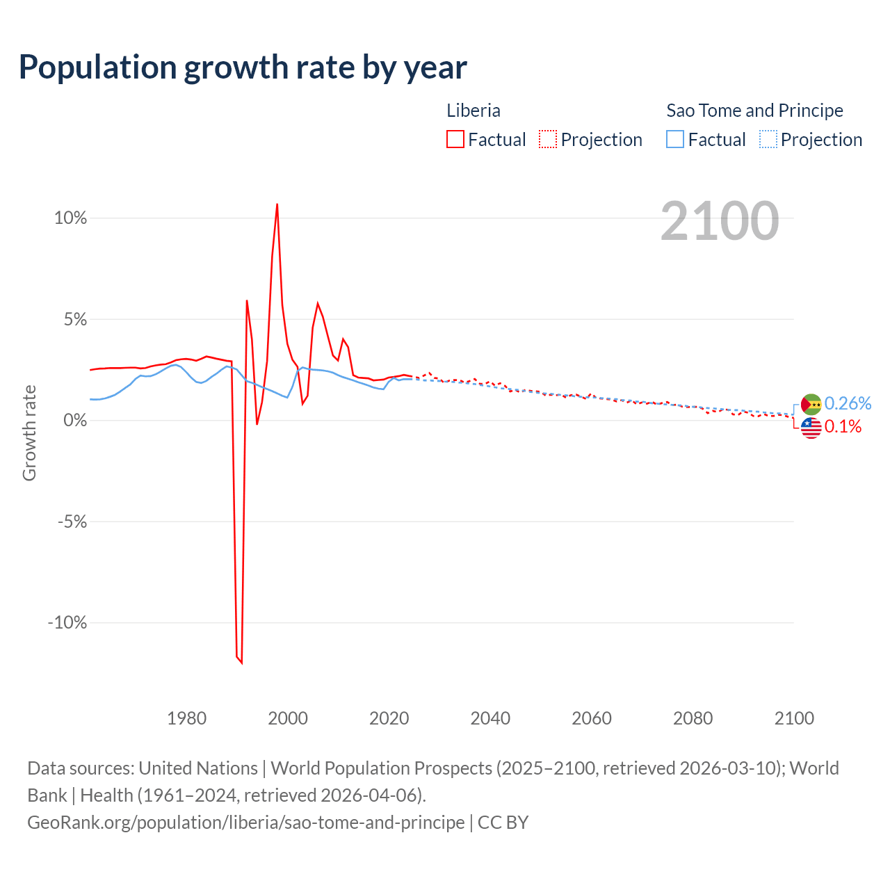 - For the last 10 years, Liberia has had an average growth rate of +2.09% per year vs +1.82% in Sao Tome and Principe.