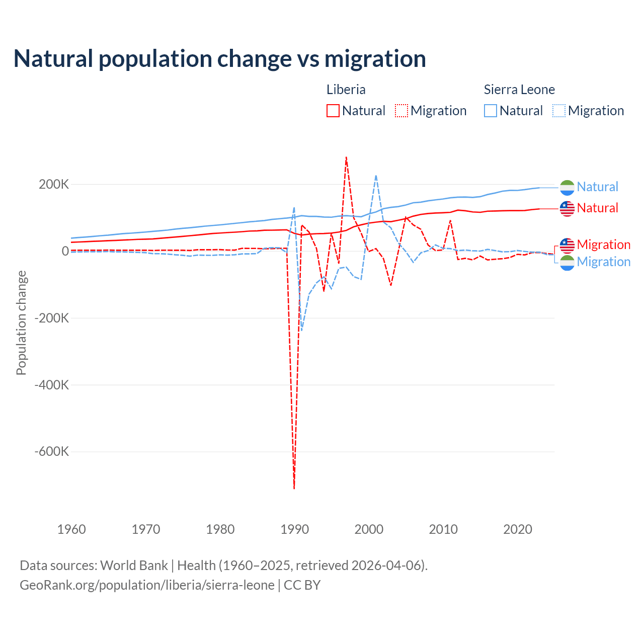 Over the last 10 years, 87.7% of the population change in Liberia is from natural causes (a gain of 1,202,387 people) and 12.3% is from migration (a loss of 168,316 people). In Sierra Leone 99.6% is from natural causes (a gain of 1,764,049 people) and 0.41% is from migration (a loss of 7,211 people).