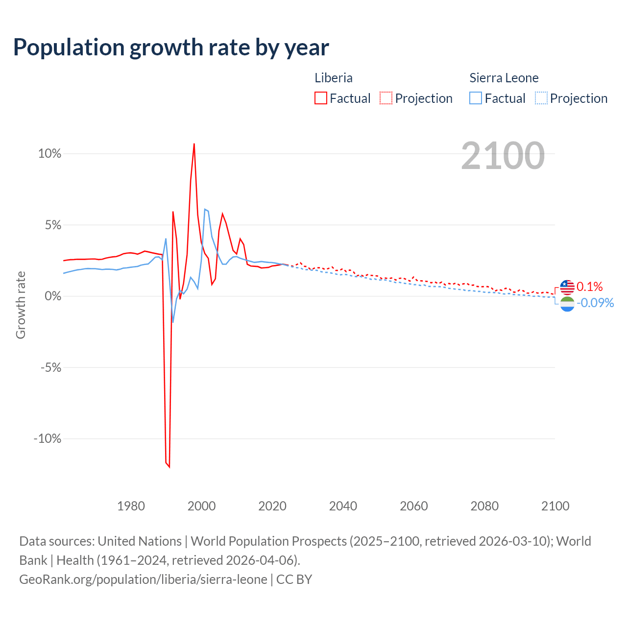 - For the last 10 years, Liberia has had an average growth rate of +2.09% per year vs +2.32% in Sierra Leone.