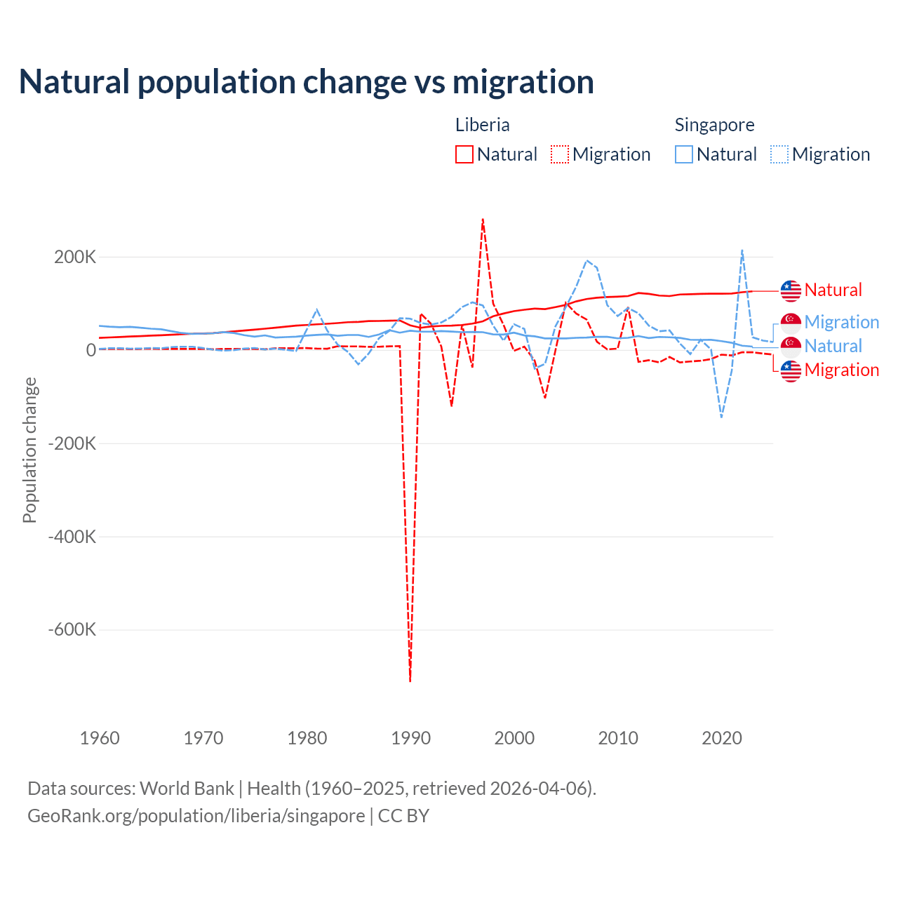 Over the last 10 years, 87.7% of the population change in Liberia is from natural causes (a gain of 1,202,387 people) and 12.3% is from migration (a loss of 168,316 people). In Singapore 54.8% is from natural causes (a gain of 195,953 people) and 45.2% is from migration (a gain of 161,805 people).
