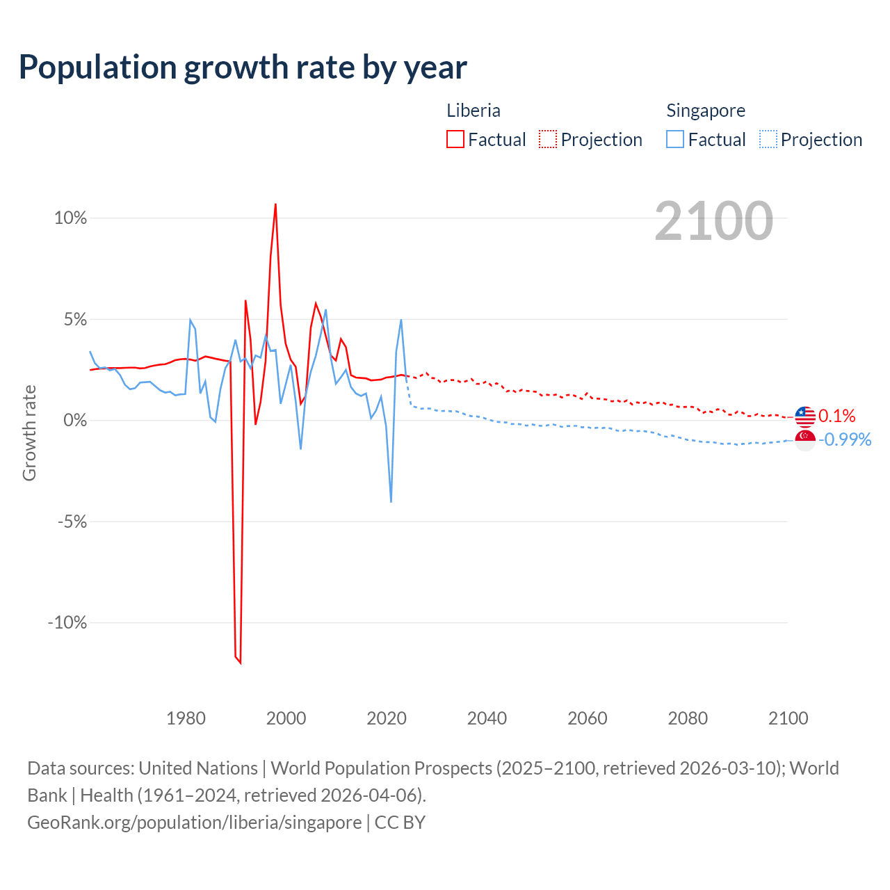 - For the last 10 years, Liberia has had an average growth rate of +2.09% per year vs +1.04% in Singapore.