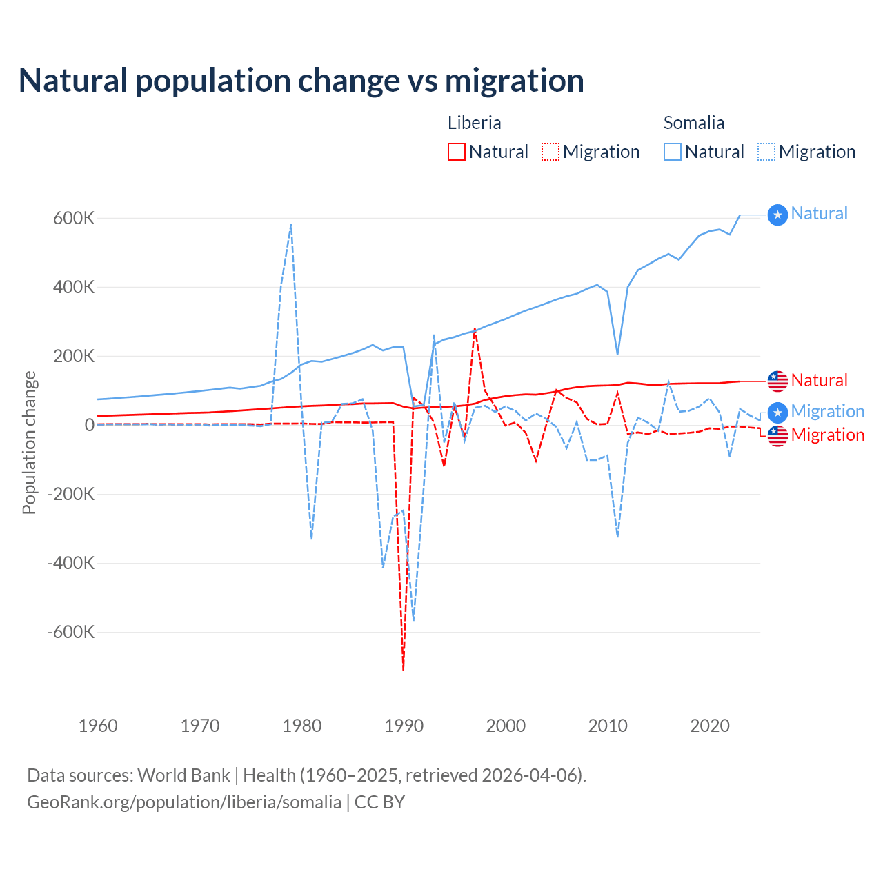 Over the last 10 years, 87.7% of the population change in Liberia is from natural causes (a gain of 1,202,387 people) and 12.3% is from migration (a loss of 168,316 people). In Somalia 94.4% is from natural causes (a gain of 5,270,105 people) and 5.58% is from migration (a gain of 311,487 people).