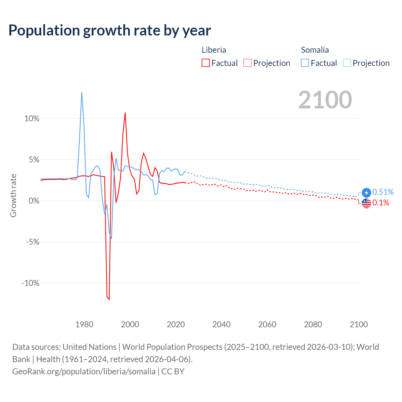 - For the last 10 years, Liberia has had an average growth rate of +2.09% per year vs +3.61% in Somalia.