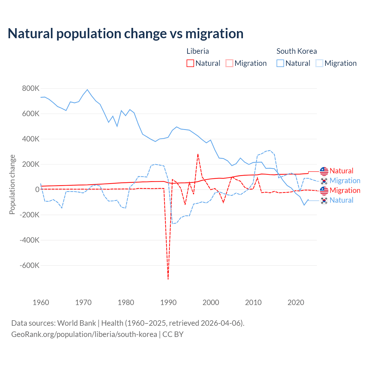 Over the last 10 years, 87.7% of the population change in Liberia is from natural causes (a gain of 1,202,387 people) and 12.3% is from migration (a loss of 168,316 people). In South Korea 17.6% is from natural causes (a gain of 277,215 people) and 82.4% is from migration (a gain of 1,298,356 people).