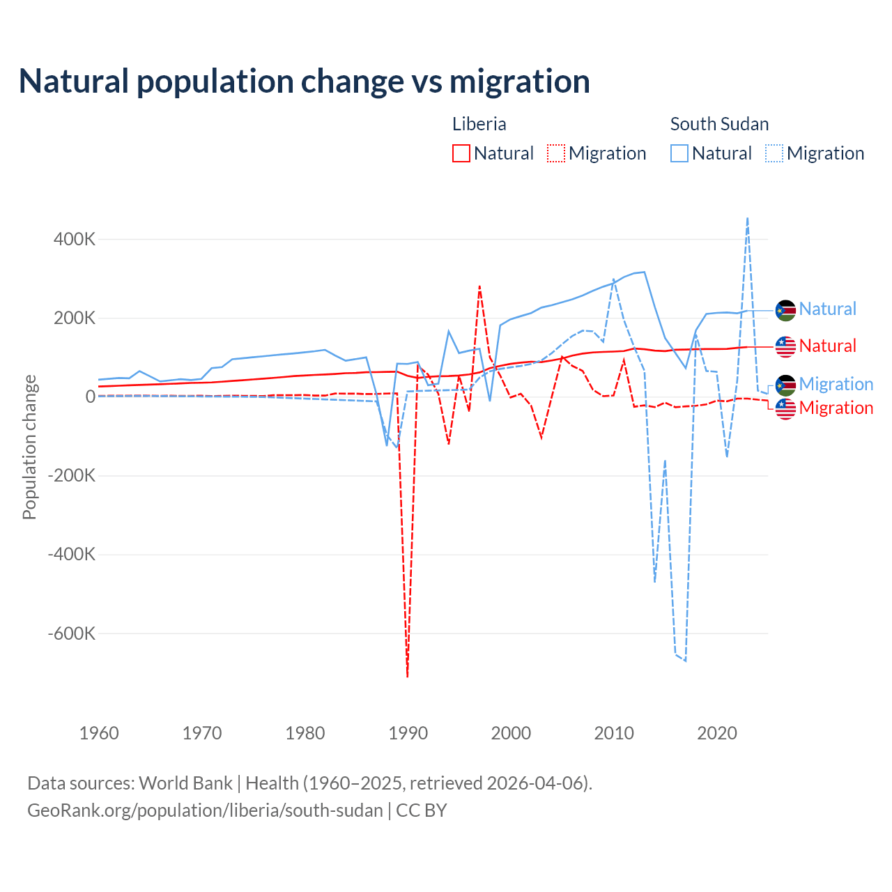 Over the last 10 years, 87.7% of the population change in Liberia is from natural causes (a gain of 1,202,387 people) and 12.3% is from migration (a loss of 168,316 people). In South Sudan 57.4% is from natural causes (a gain of 1,792,135 people) and 42.6% is from migration (a loss of 1,329,606 people).