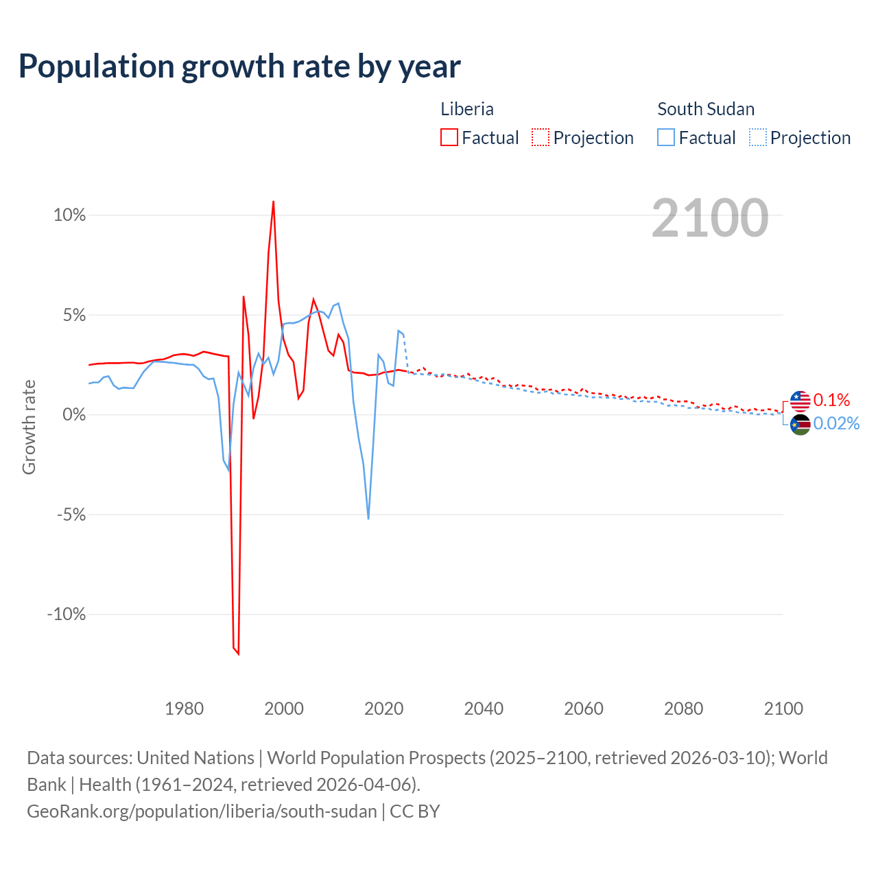 - For the last 10 years, Liberia has had an average growth rate of +2.09% per year vs +0.65% in South Sudan.