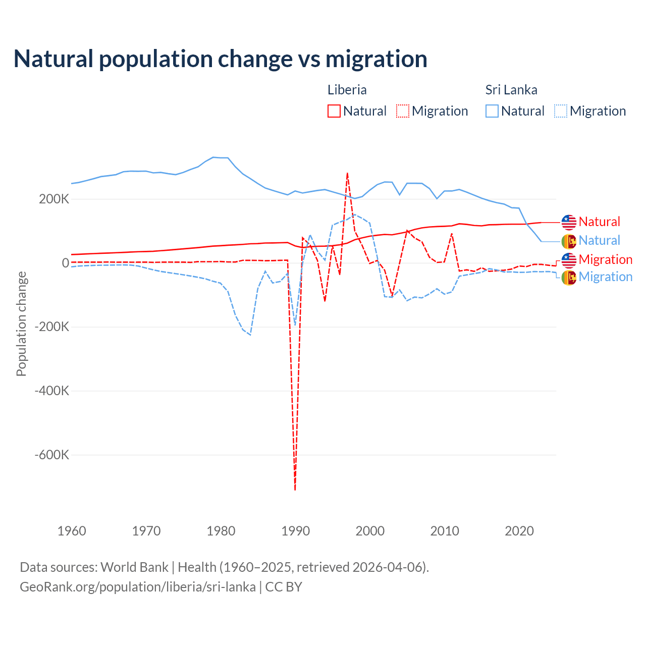 Over the last 10 years, 87.7% of the population change in Liberia is from natural causes (a gain of 1,202,387 people) and 12.3% is from migration (a loss of 168,316 people). In Sri Lanka 85.3% is from natural causes (a gain of 1,605,749 people) and 14.7% is from migration (a loss of 276,121 people).