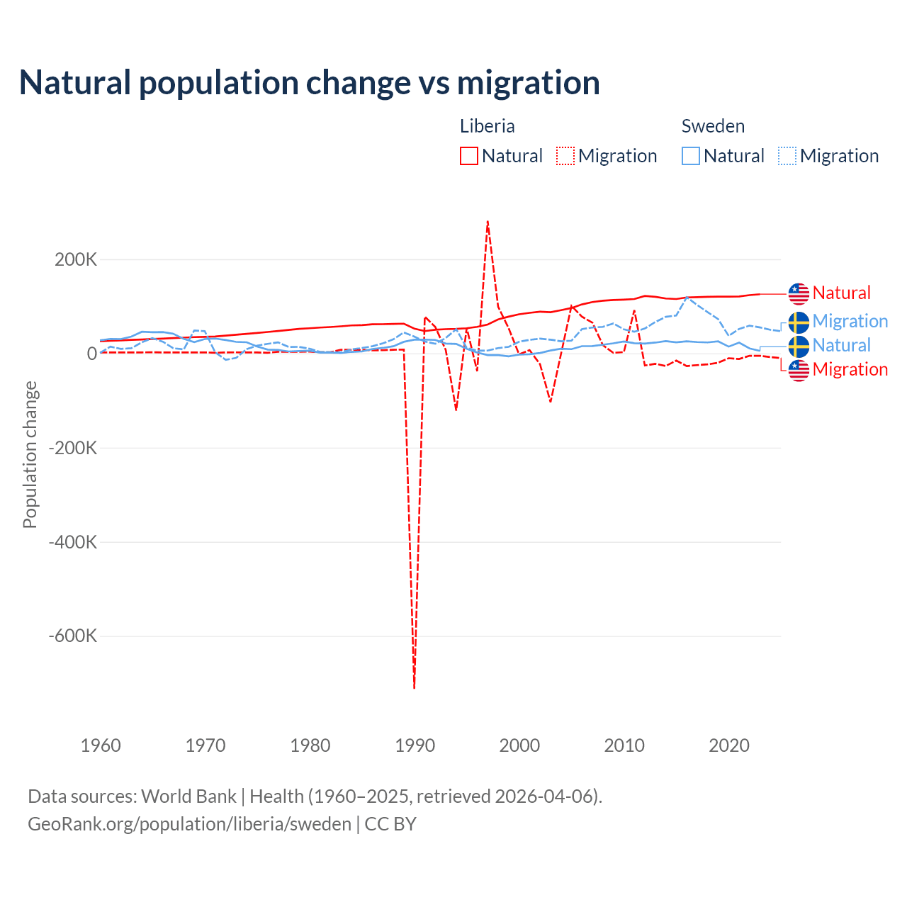 Over the last 10 years, 87.7% of the population change in Liberia is from natural causes (a gain of 1,202,387 people) and 12.3% is from migration (a loss of 168,316 people). In Sweden 21.4% is from natural causes (a gain of 201,900 people) and 78.6% is from migration (a gain of 743,642 people).