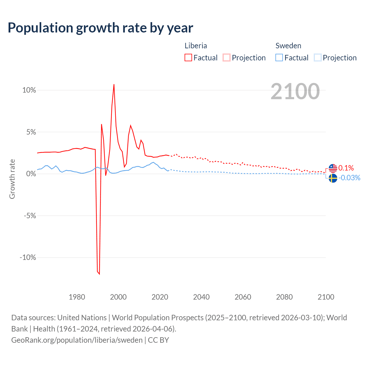 - For the last 10 years, Liberia has had an average growth rate of +2.09% per year vs +0.88% in Sweden.